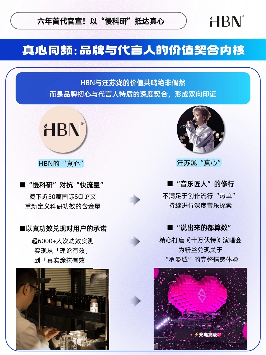 🟡在当下美妆圈流量代言扎堆、短期营销套路层出不穷,护肤领域还深陷“功效吹得响、效果看不见”的信任难题时,HBN从2019年成立起就不追营销热度,一门心思扎进科研里,发表近50篇国际sci论文,用超6000人次的真人实测兑现真功效承诺,真正实现了数量与含金量的双重引领。这与汪苏泷作为“音乐匠人”不随大流的特质,如出一辙。