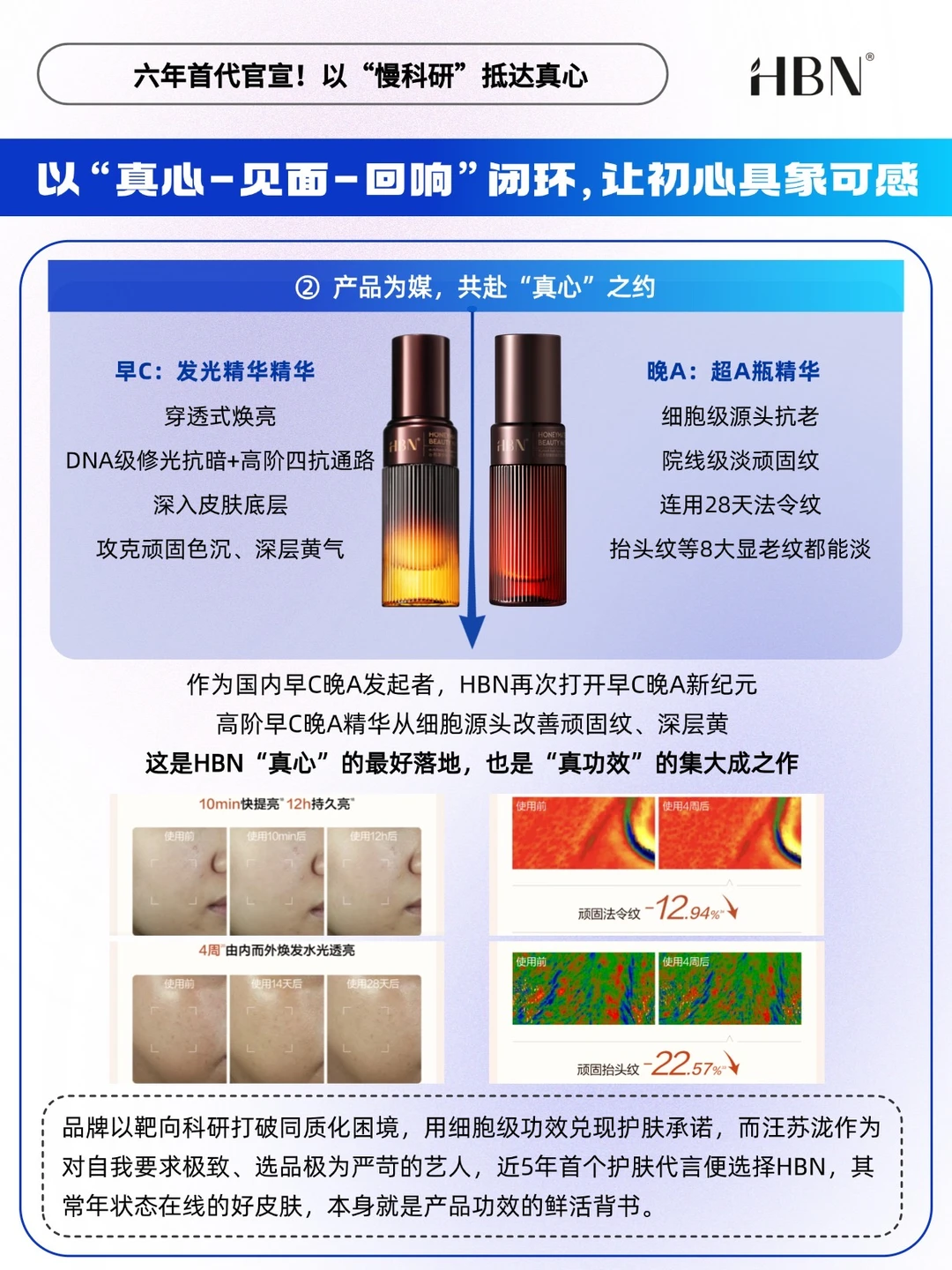 🟡正如汪苏泷“每一年我的音乐里都要听到新的东西”的自我要求,HBN在早C晚A领域也开创了新纪元。革新之作高阶早C晚A精华,不同于市面上停留于表面的早C晚A,它能从细胞源头高效攻克顽固纹和深层黄,效果进阶的同时肤感温和,真正解决25+用户衰老暗沉问题难改善、对早C晚A成分刺激的顾虑。