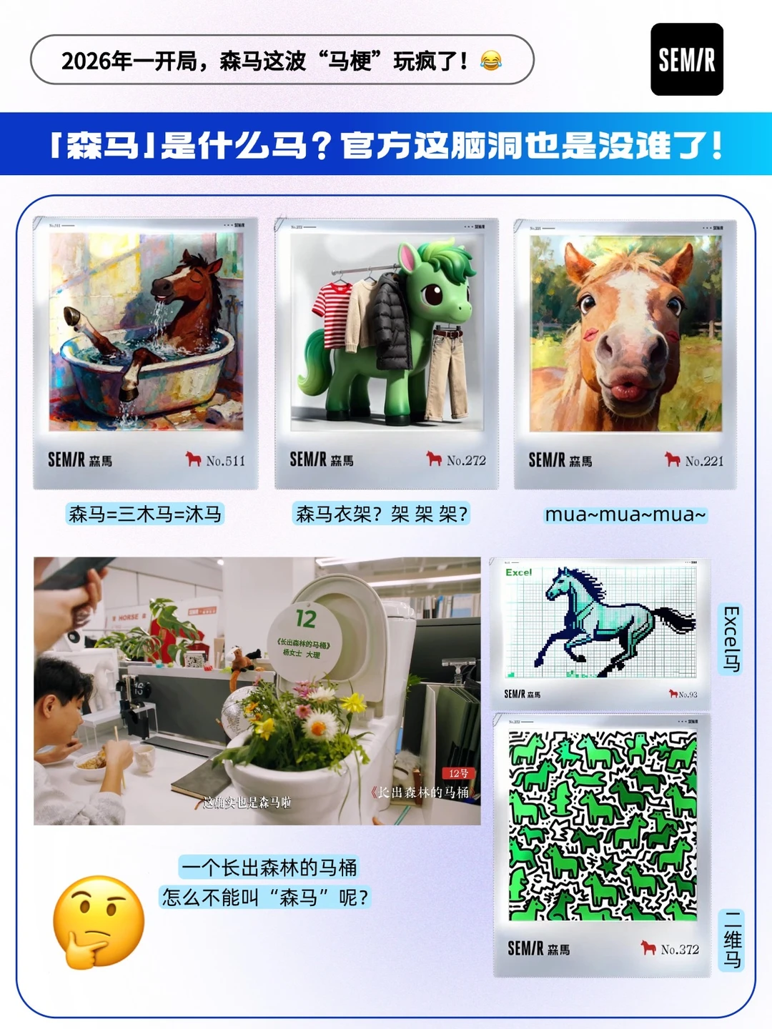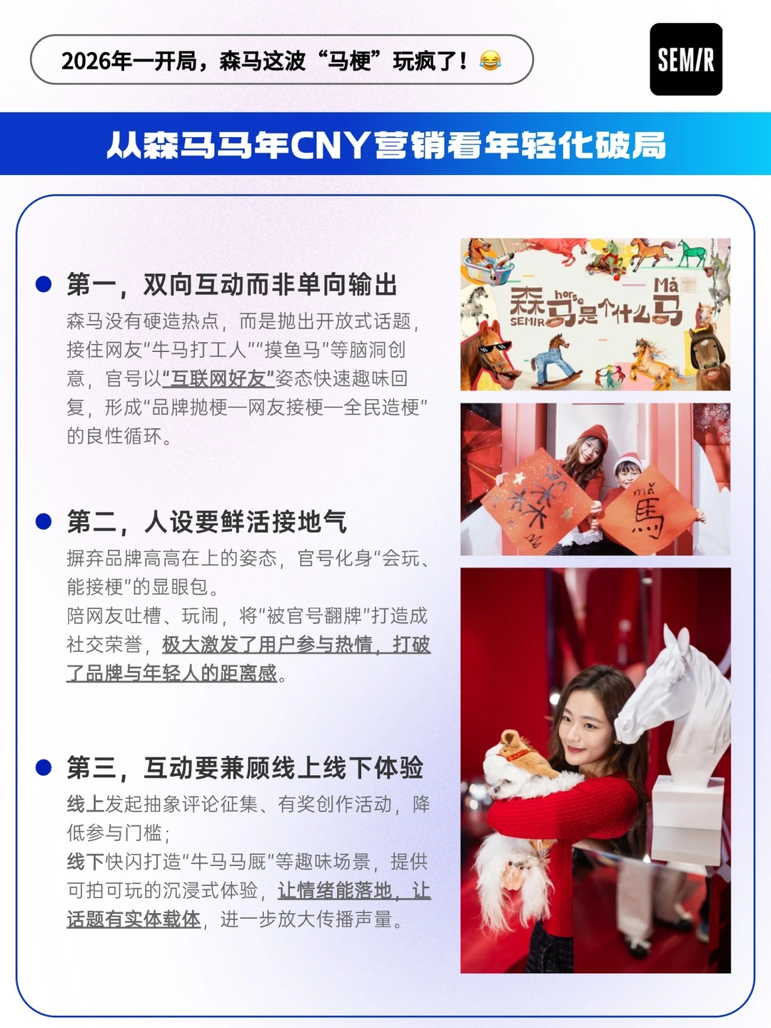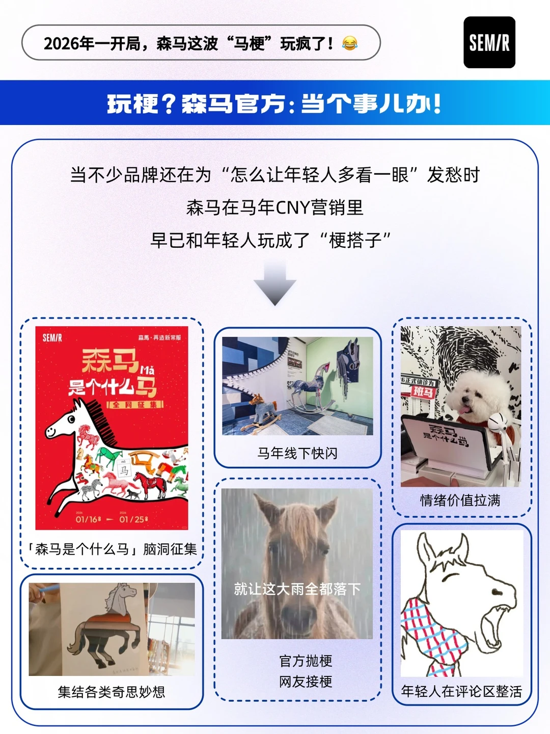 🟠2026马年一开局,森马没走常规的CNY套路,凭着“森马是个什么马” 的趣味发问,从「官方玩梗」到「年轻人造梗」,硬是把品牌营销玩成了年轻人的脑洞狂欢。