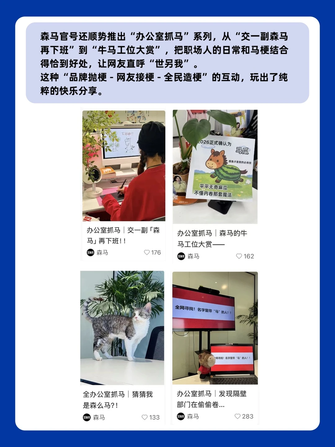 🟠森马官号还顺势推出“办公室抓马”系列,从“交一副森马再下班”到“牛马工位大赏”,把职场人的日常和马梗结合得恰到好处,让网友直呼“世另我”。这种“品牌抛梗 - 网友接梗 - 全民造梗”的互动,玩出了纯粹的快乐分享。