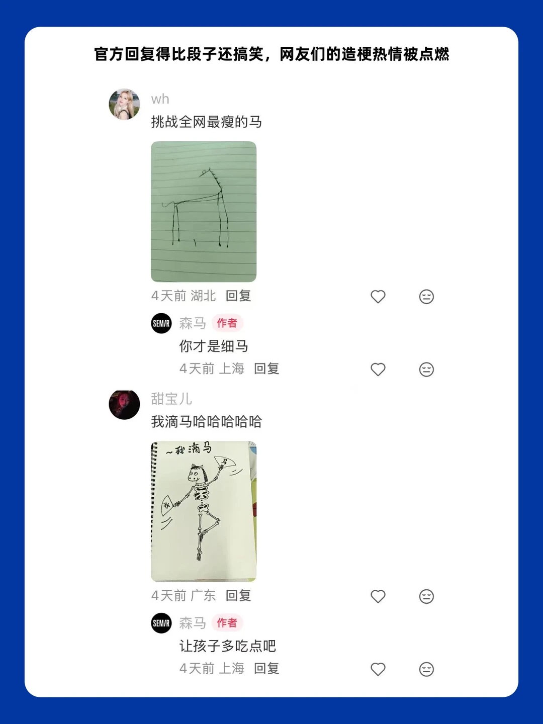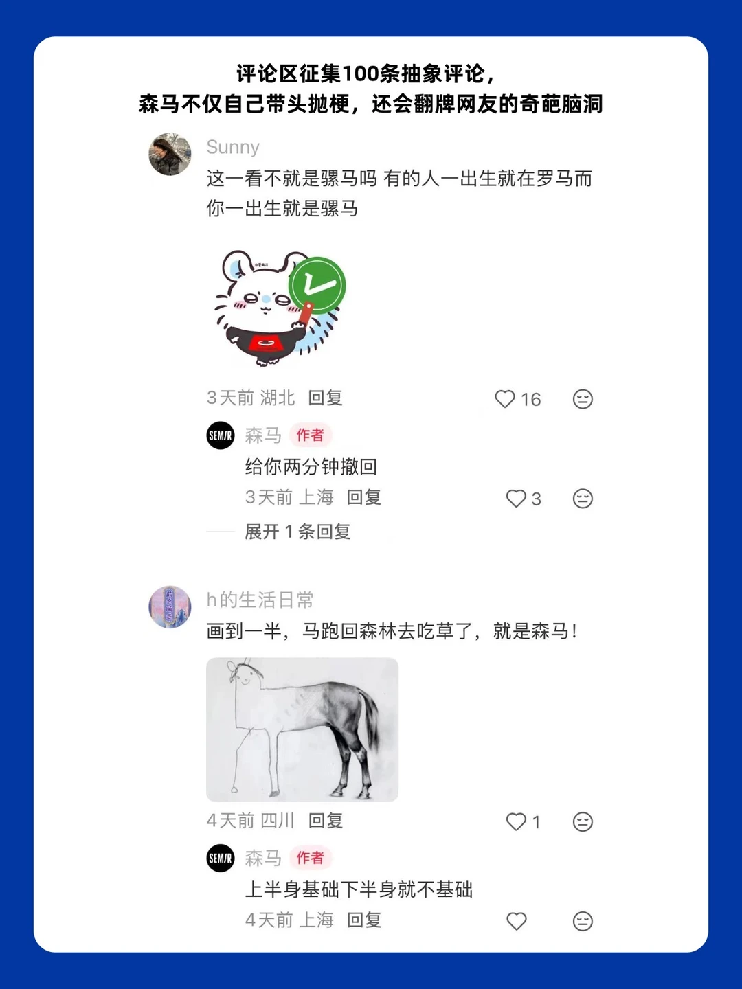 不端不装的“互联网好友”人设,让森马品牌彻底放下架子——发起“森马是个什么马”有奖征集,直接把话语权交给网友;评论区征集100条抽象评论,不仅自己带头抛梗,还会翻牌网友的奇葩脑洞,回复得比段子还搞笑hhhh,网友们的造梗热情被点燃,刺激UGC内容在社交平台疯狂传播。