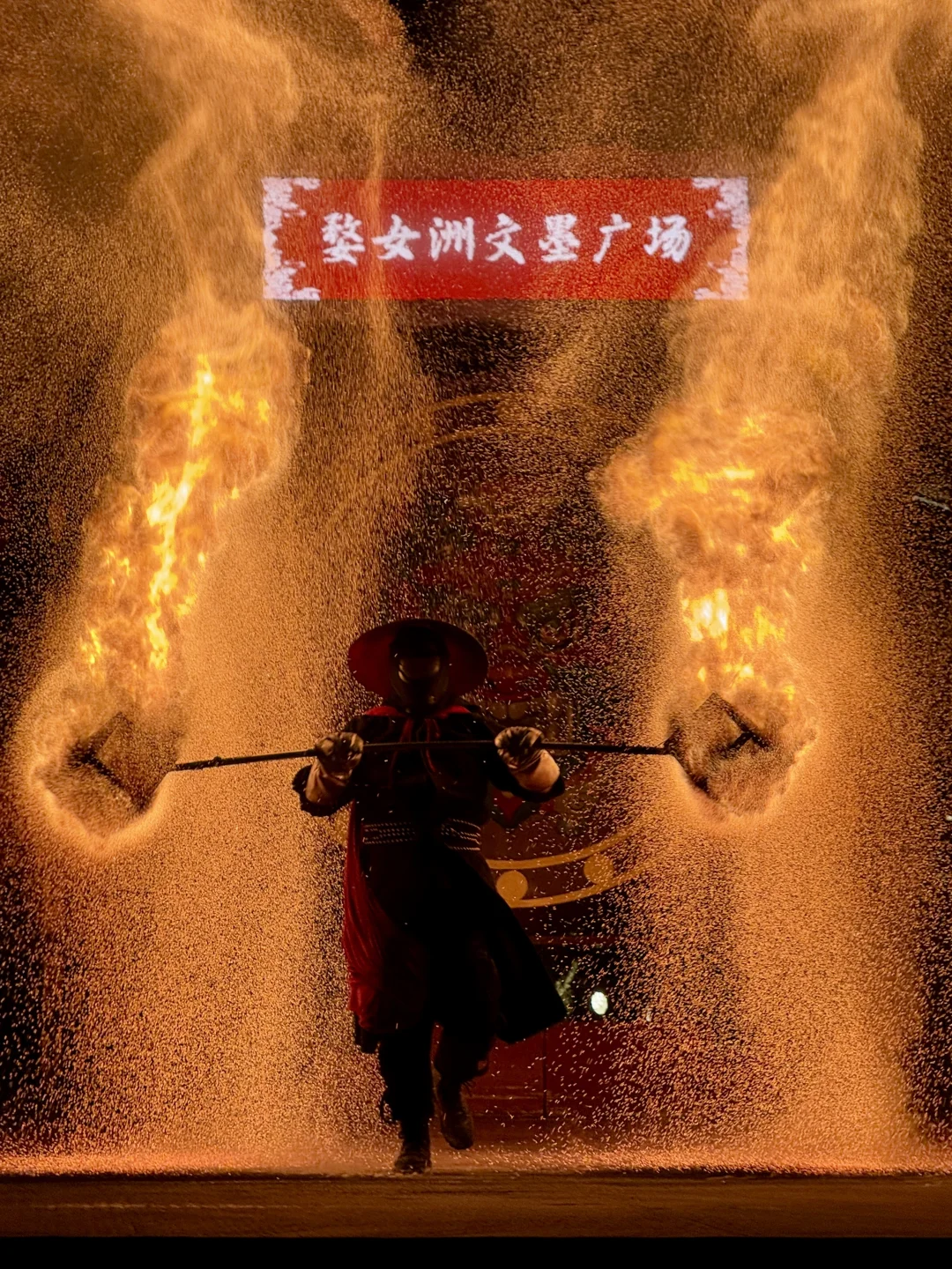 “火除邪祟,百家安宁”人与火共舞,在火中起舞的人仿佛从黑暗中带着光明走来,有一种火神祝融再现的震撼感!