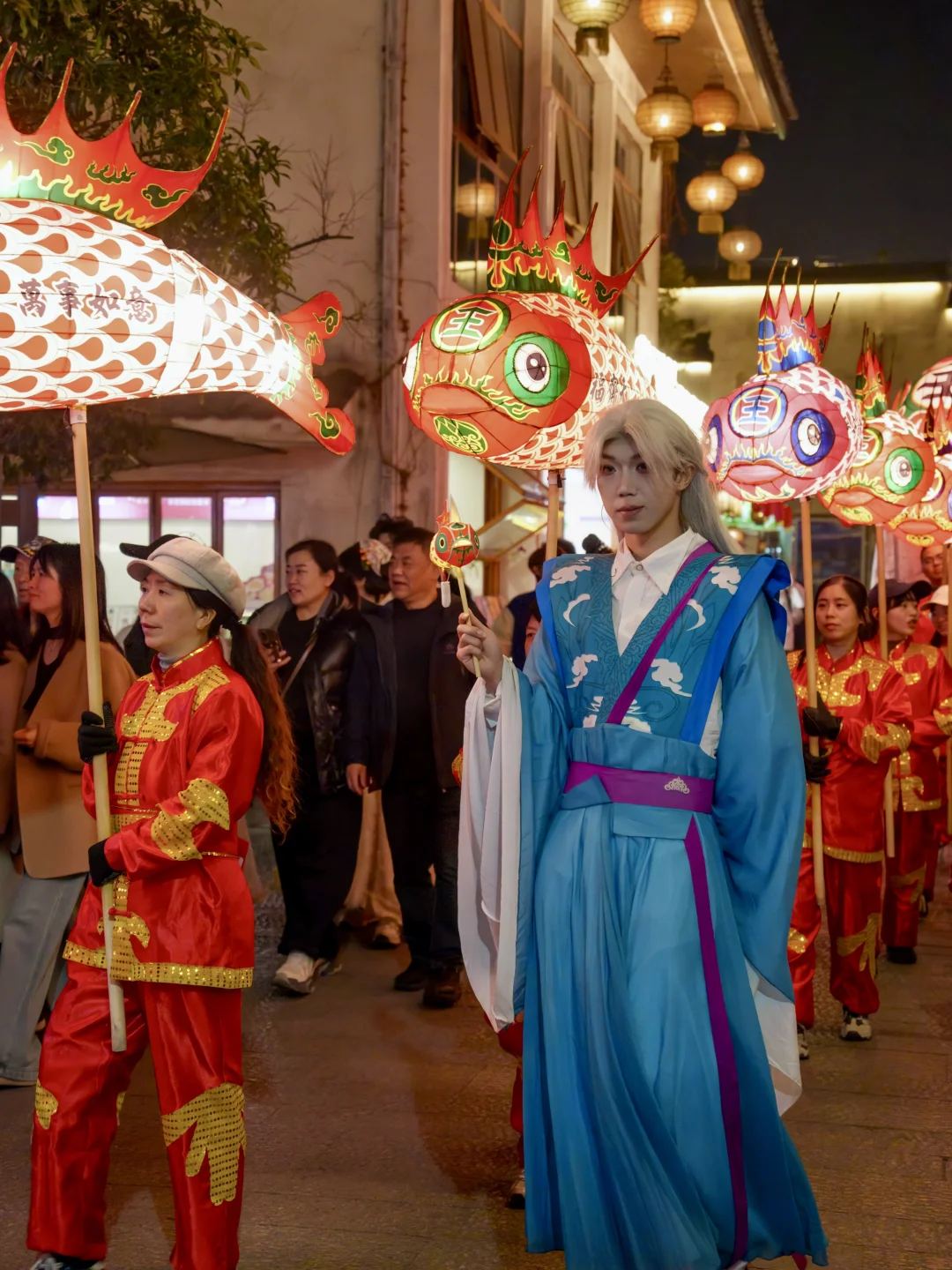 当夜幕降临,巡游的鱼灯从白墙黛瓦的古建筑间缓缓穿过,点亮万家灯火,太浪漫了!