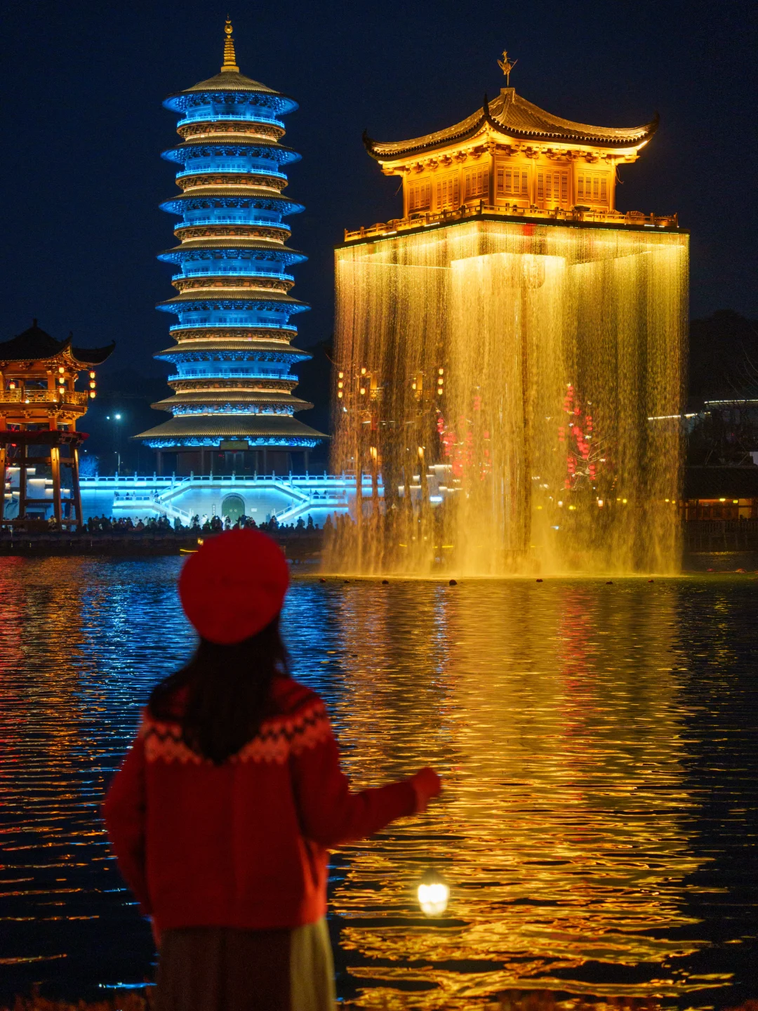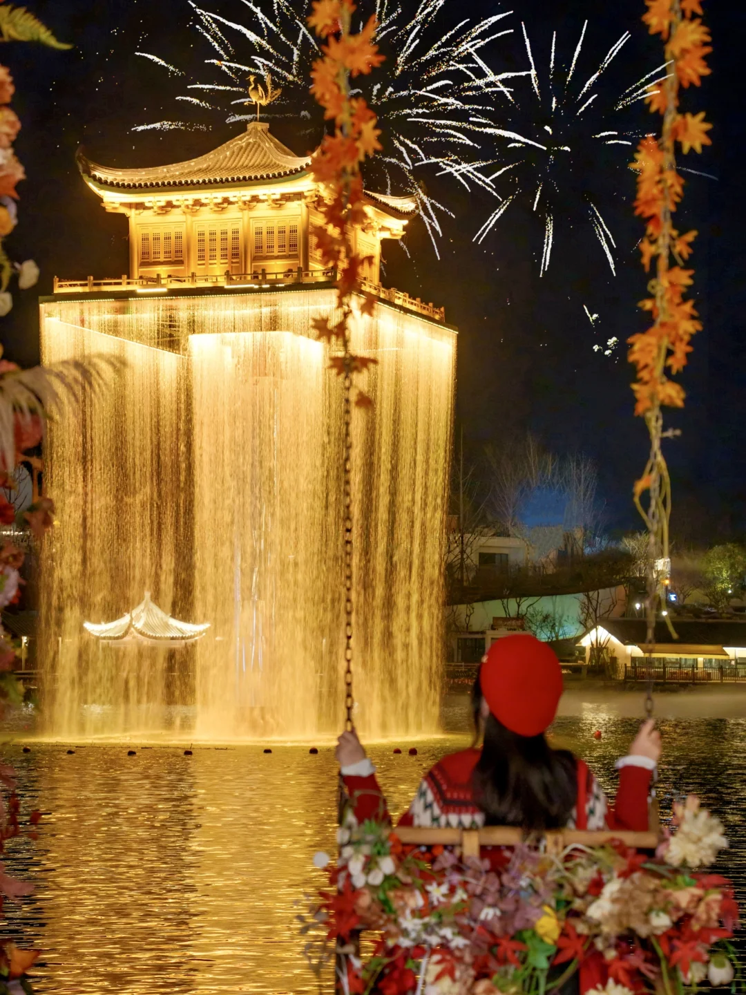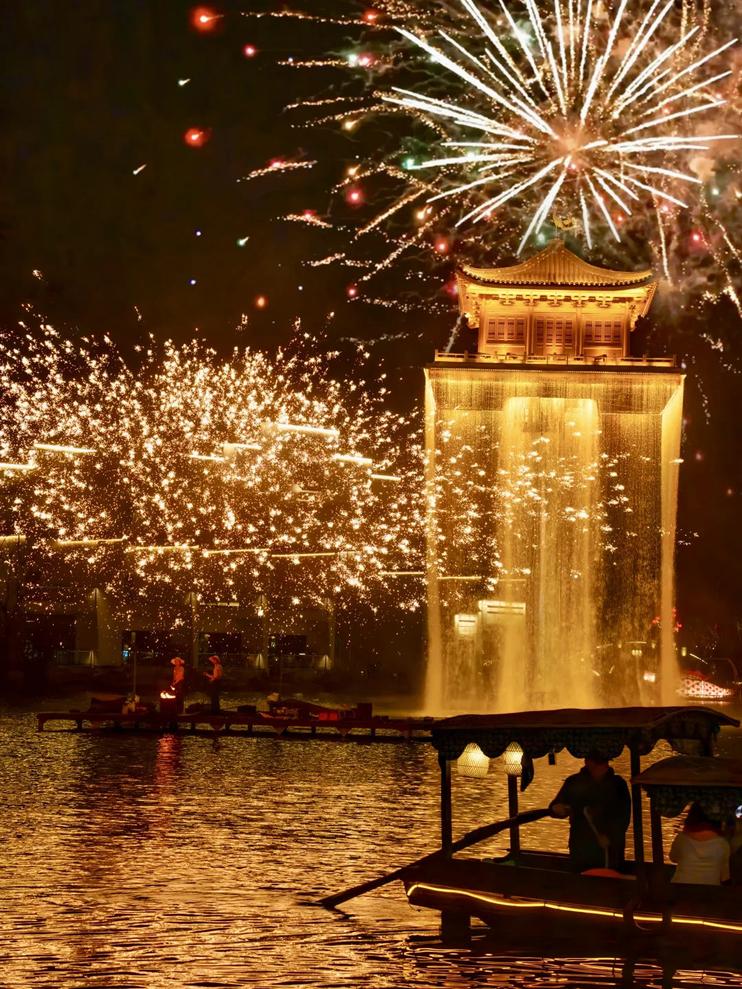 烟花盛放,映照着抱玉塔,浪漫至极,才知道古人笔下的天上宫阙有多惊艳!