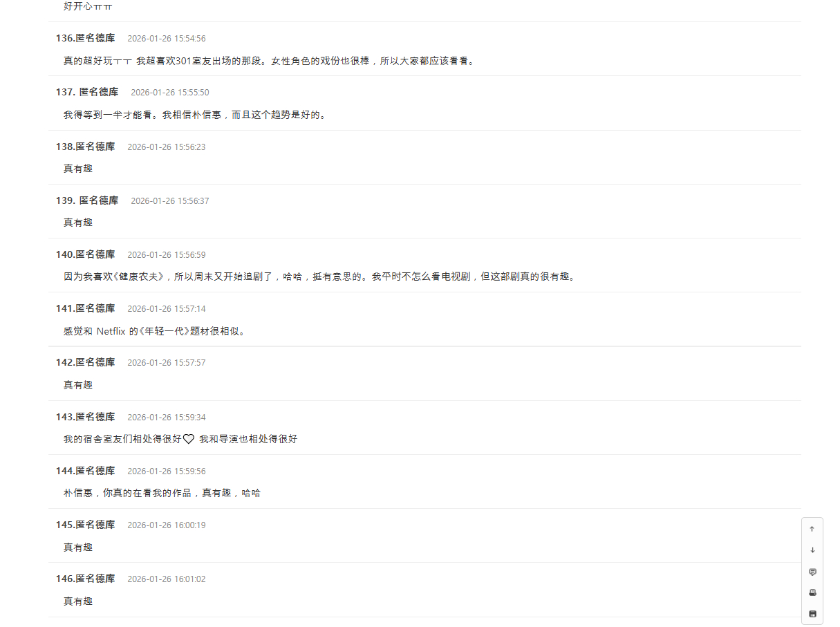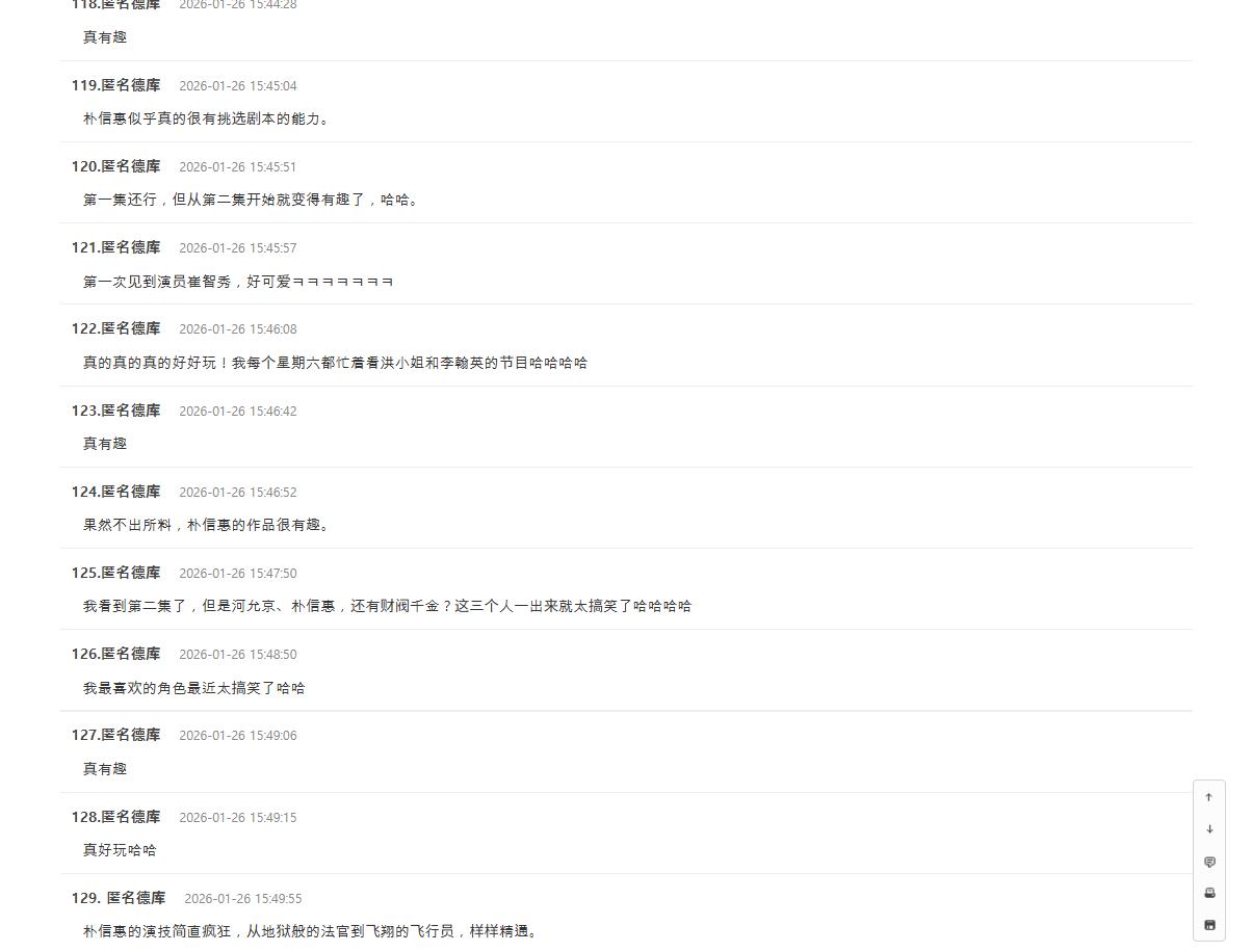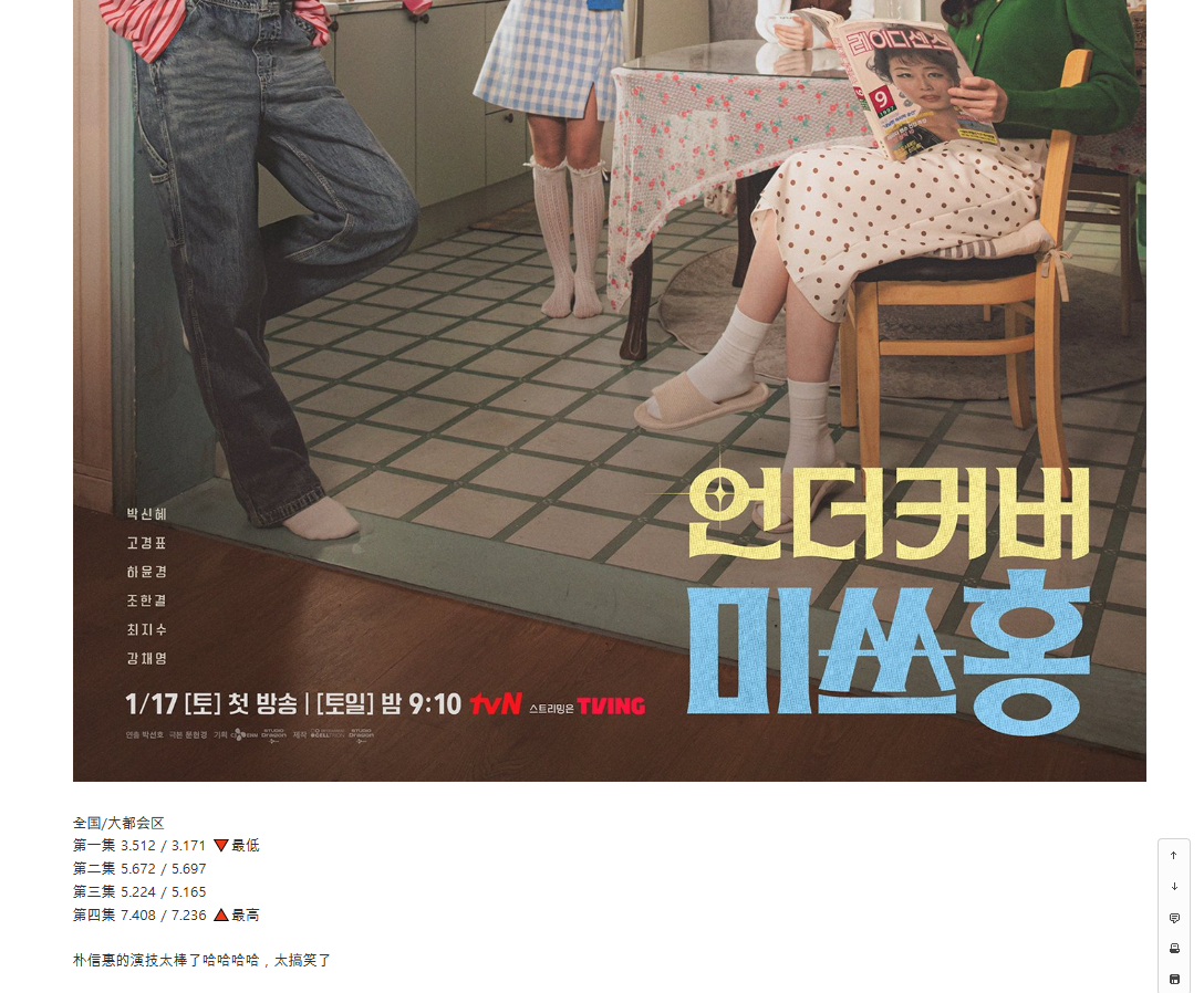 朴信惠 ✨undercovermisshong theqoo热帖 阅读量2.6万+,评论数241,下午一点多发的帖子,目前在热门首页~标题【电视剧洪小姐在短短两周内收视率翻了一番多】评论区都是夸夸,夸剧情有趣,夸朴信惠演技好,夸配角演技好图片是机翻,随机挑选几条评论翻译如下:朴信惠真的是收视率神器啊!追了直播也太好看了哈哈哈哈哈哈,既有搞笑桥段,和金元海的对手戏也超逗~ 朴信惠把角色的小机灵劲儿演得超棒,全体演员演技也全程在线,太爱了!朴信惠选剧本的眼光是真的好耶~果然好看,不愧是朴信惠!从《来自地狱的法官》开始,朴信惠的演技就一路开挂,真的绝了!真的超级好看呜呜呜,301 号的室友们一出场就超喜欢,女性叙事也很赞,大家都去看啊…朴信惠看剧本的眼光真的绝了哈哈哈哈,而且还能用演技稳稳 hold 住!朴信惠挑剧命中率也太高了吧,闭眼追就行~朴信惠真的太会演了,每次和金元海同框都笑到不行!不是,朴信惠的演技简直绝了哈哈哈哈哈哈,《来自地狱的法官》?不管怎么说,上一部作品里演技就超顶,这次是真的封神了哈哈哈哈~朴信惠在这部剧里的演技真的完美适配,简直绝了哈哈哈哈哈哈!难怪这么好看,昨天看的时候还略带点动作喜剧片的感觉哈哈,整体基调把控得超好~我们家人也因为是朴信惠演的,从第一集就追着看~全程无尿点,越看越上头,太绝了!超级好看哈哈哈哈哈哈,室友们都好可爱讨喜,还有危机管理部的大家也超棒哈哈哈哈哈哈!