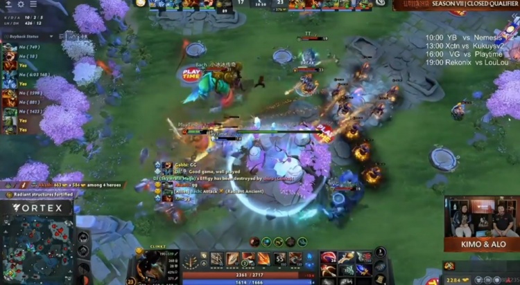 28分钟VG逮捕对手双酱油之后拿下二代肉山!shiro飞机继续带盾!随后VG站上高地,击杀对手四人逼出双酱油买活,拆完上路高地之后转中,再破中路高地!拉开14K经济差了!35分钟高地团Xm影魔摇大瞬秒Armel拉席克逼出买活,XG逐个击破团灭Playtime,shiro飞机超神结尾!这样VG就2-0击败对手,晋级胜者组第二轮!