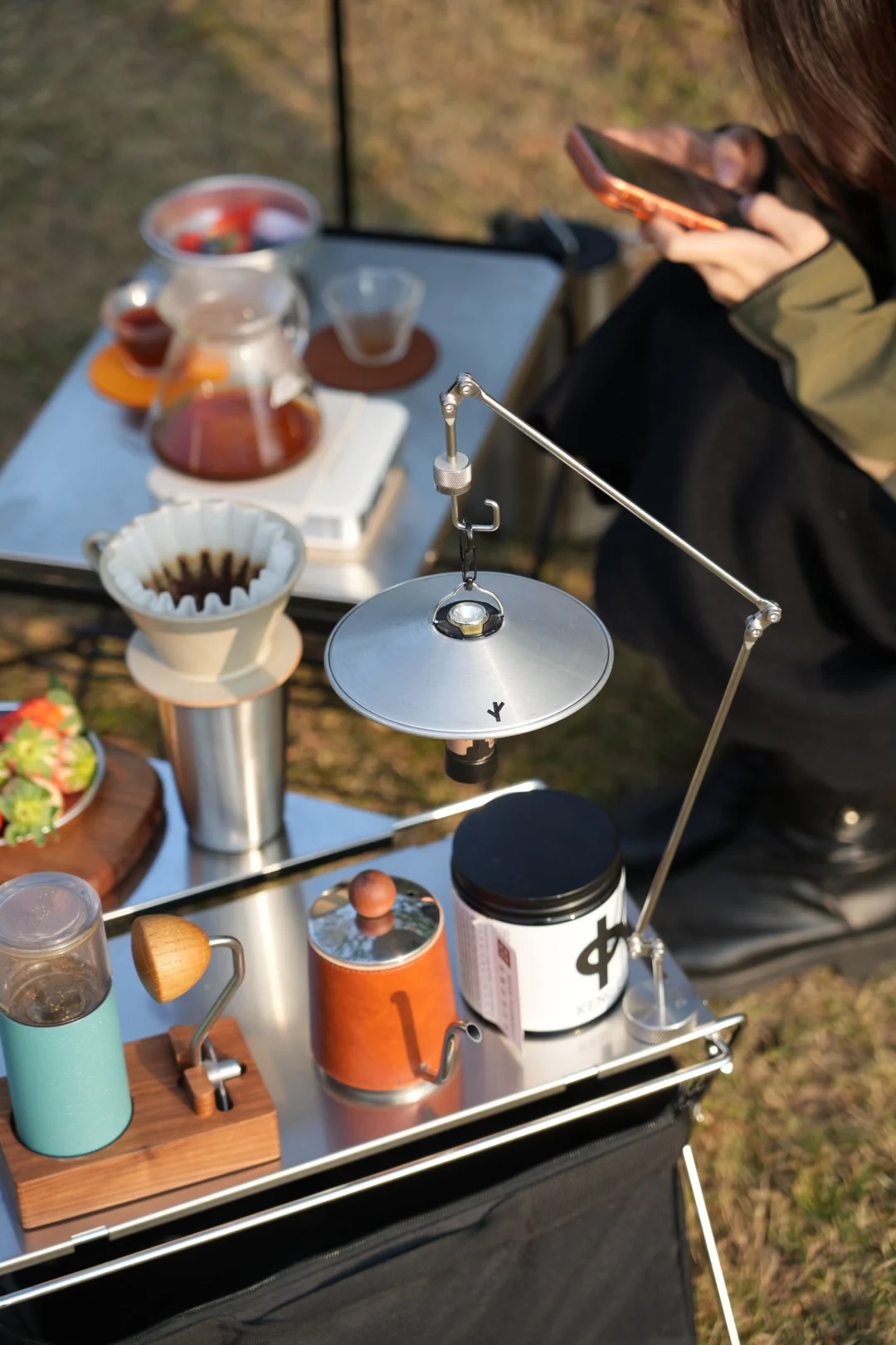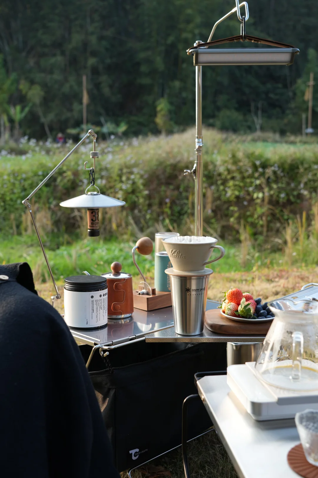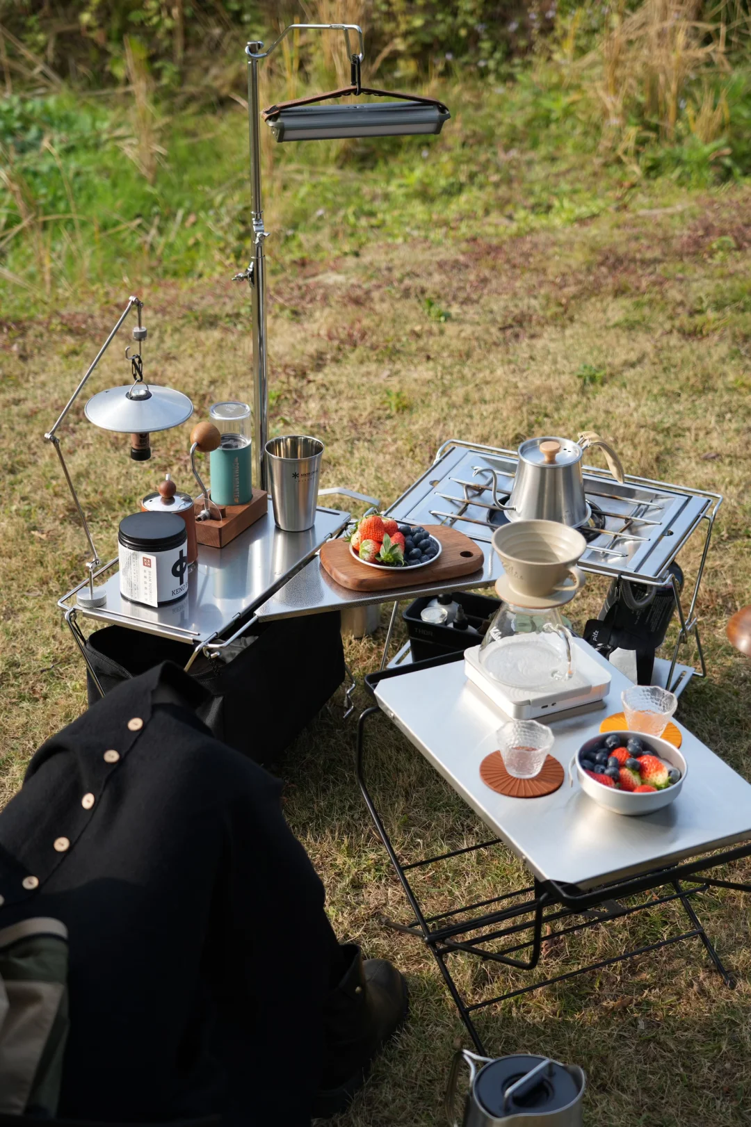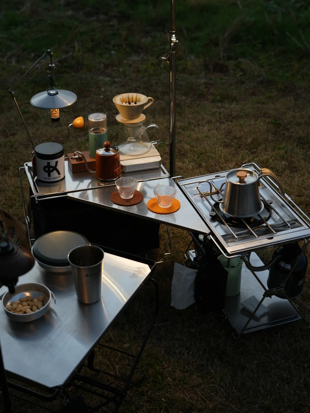 1个TC的IGT框架➕1个小钢桌通过一块三角板组成一个轻量化的户外厨房区,双层转角的布置即能操作,也有置物的空间。搭配它们家的磁吸灯杆,晚上灯光亮起,金属在灯光的映射下闪闪发亮✨