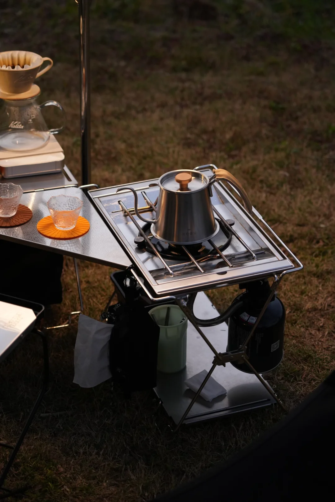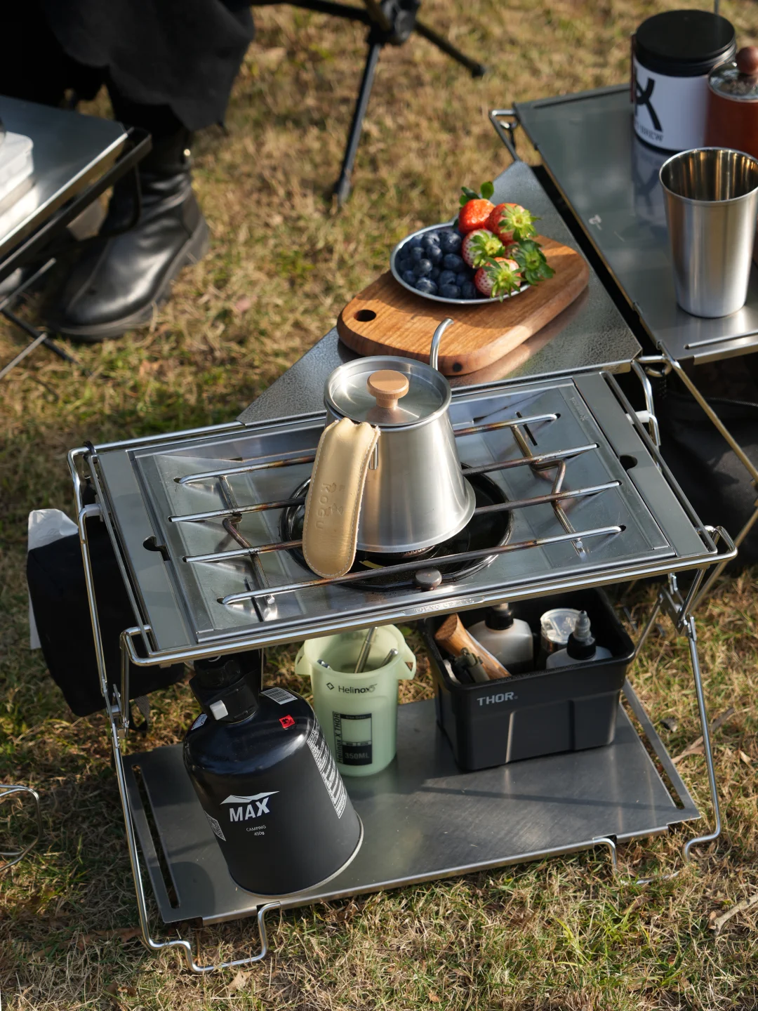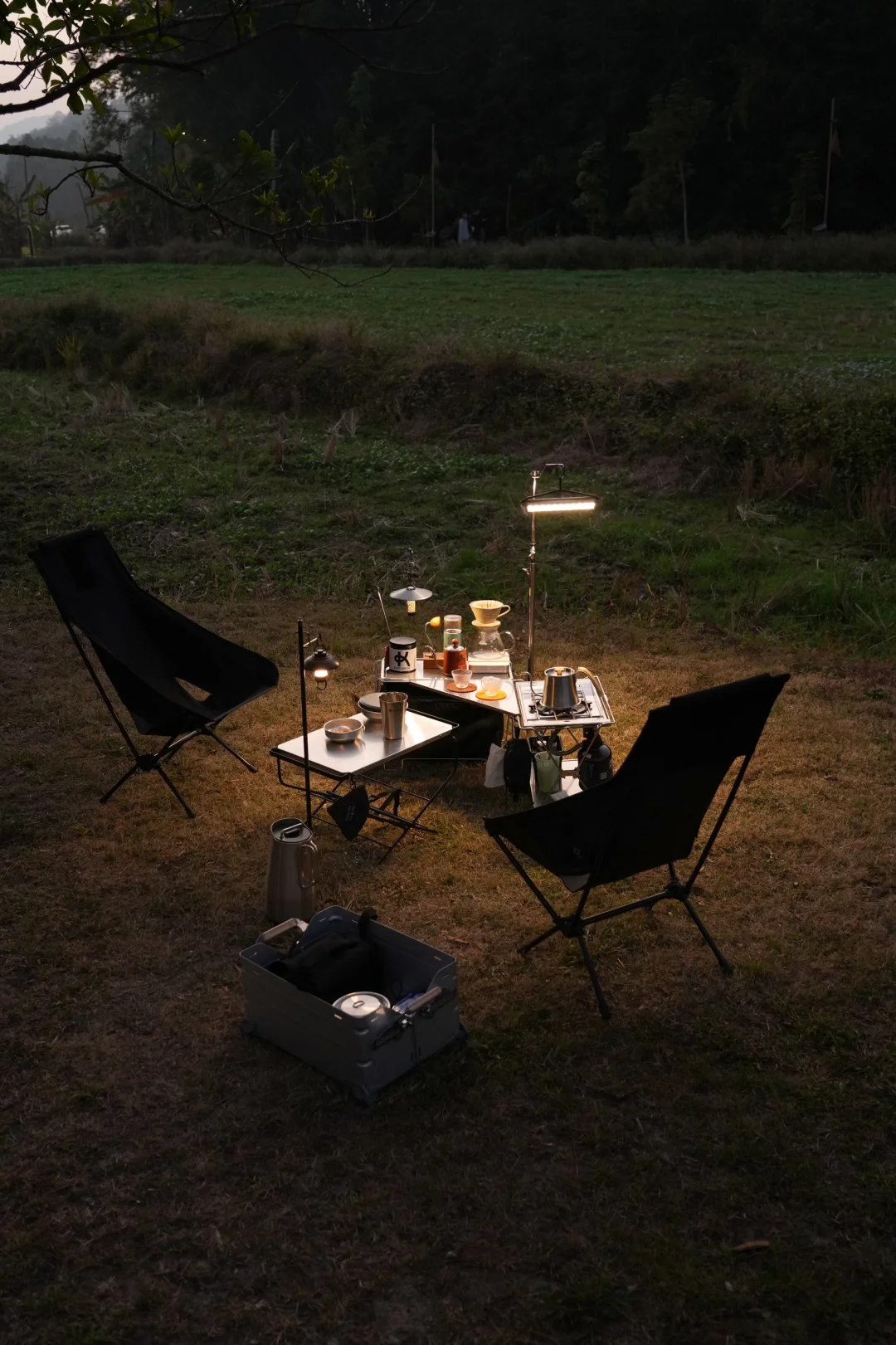 1个TC的IGT框架➕1个小钢桌通过一块三角板组成一个轻量化的户外厨房区,双层转角的布置即能操作,也有置物的空间。搭配它们家的磁吸灯杆,晚上灯光亮起,金属在灯光的映射下闪闪发亮✨