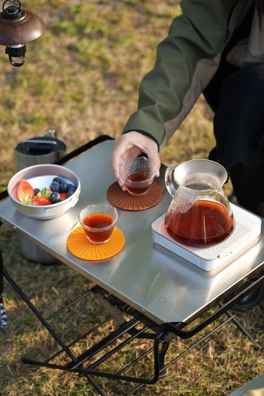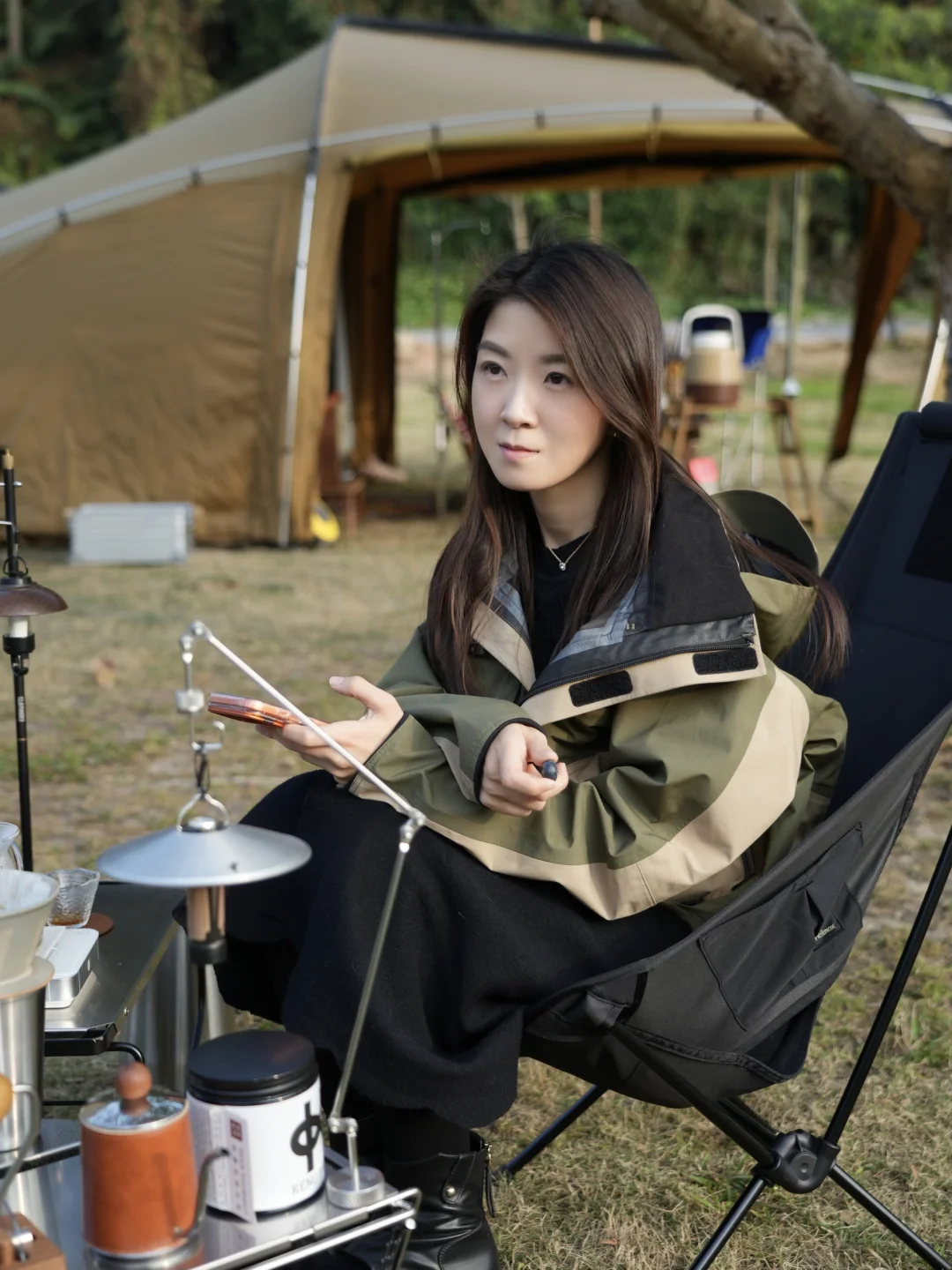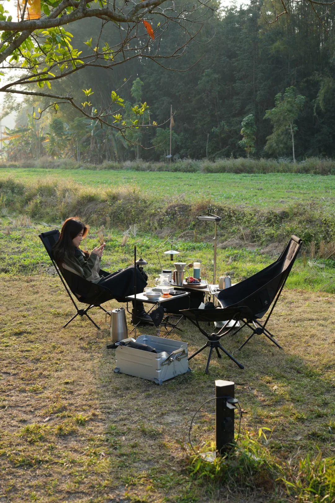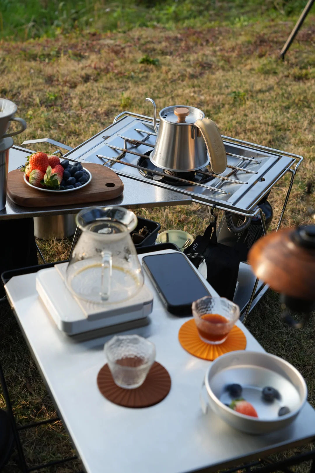 1个TC的IGT框架➕1个小钢桌通过一块三角板组成一个轻量化的户外厨房区,双层转角的布置即能操作,也有置物的空间。搭配它们家的磁吸灯杆,晚上灯光亮起,金属在灯光的映射下闪闪发亮✨