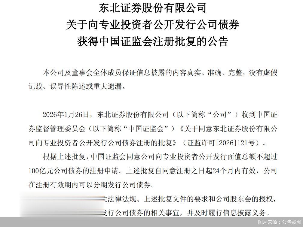 北京商报讯(记者李海媛)1月26日,东北证券发布公告称,收到中国证监会批复,中国证监会同意公司向专业投资者公开发行面值总额不超过100亿元公司债券的注册申请。上述批复自同意注册之日起24个月内有效,东北证券在注册有效期内可以分期发行公司债券。