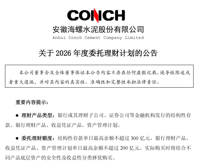 1月26日,海螺水泥发布2026年度委托理财计划公告称,公司及下属子公司拟利用暂时闲置自有资金购买结构性存款单日最高余额不超过300亿元,购买银行理财产品、收益凭证产品、资产管理计划单日最高余额不超过200亿元。