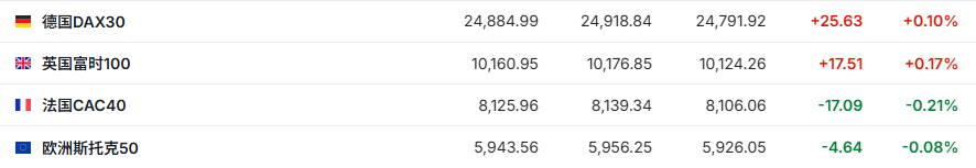 2.截至发稿,德国DAX指数涨0.10%,英国富时100指数涨0.17%,法国CAC40指数跌0.21%,欧洲斯托克50指数跌0.08%。