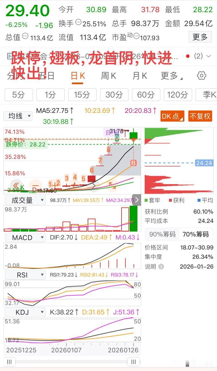 1月26日收盘 第一、当日市场特征 走势:高开低走,呈现明显的切换,权重走强于题材,超3775家个股下跌,市场情绪低迷。 资金与量能:成交量达3.25万亿元,创近期天量,但主力资金净流出超1000亿元,反映资金分歧加剧。 板块:贵金属、有色金属、下午医药消息面催化、大金融等逆势上涨;而此前作为主线的商业航天出现退潮。 第二、指数 沪指:今天高开高走,10:30分爆量后重心上移横盘,站稳支撑线,筹码相对稳定,暂无明显出逃迹象,整体仍属强势格局。 科创板→科创50指数:创新高后震荡上行,后续继续走强,科技不变! 上证50指数:阴跌后今天出现反抽阳线,短期修复 第三、指数高开低走分析 1. 主线调整:商业航天等核心题材走弱,新主线尚未形成,资金缺乏明确进攻方向。商业航天今天封板5家,梯队虽完整,今天分化,可低吸! 2. 情绪压制:周末监管继续降温市场情绪今天负反馈。 3. 控节奏:今天压盘,防市场过热,走慢牛! 第四、仅低吸 没有主线前不追涨,仅低吸 关注方向:芯片存储、AI应用(+ )、CPU涨价、商业航天、机器人等低位且趋势向好方向。