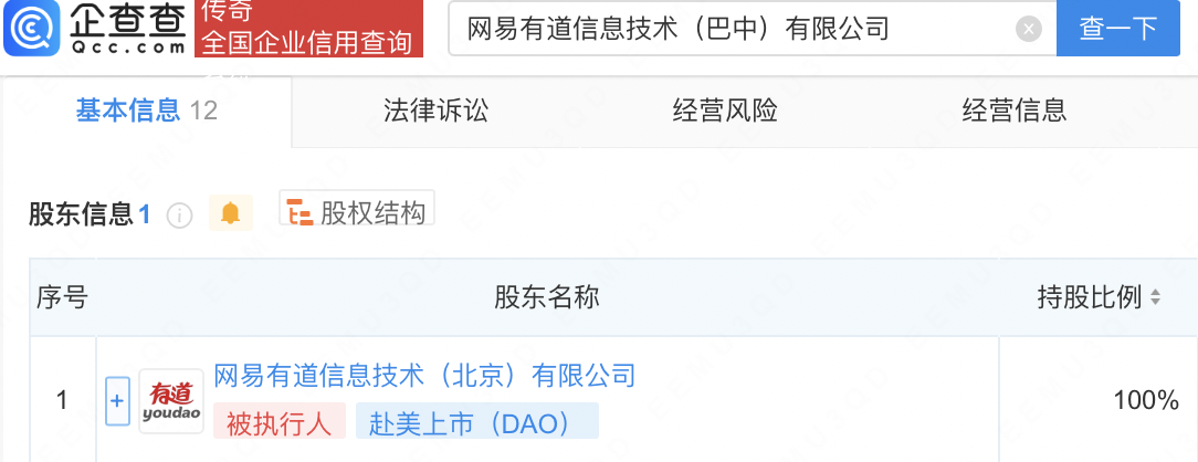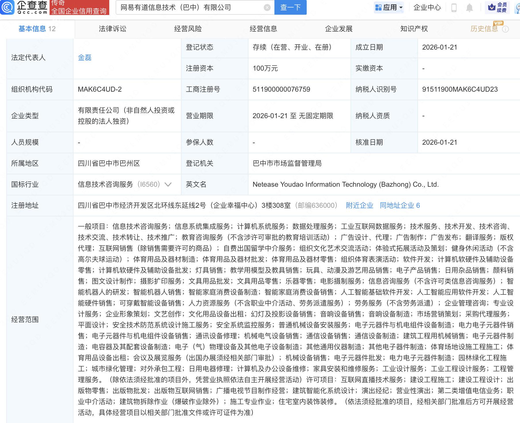 企查查APP显示,近日,网易有道信息技术(巴中)有限公司成立,经营范围包含:智能机器人的研发;智能机器人销售;人工智能基础软件开发;人工智能应用软件开发;人工智能硬件销售等。企查查股权穿透显示,该公司由网易有道信息技术(北京)有限公司全资持股。