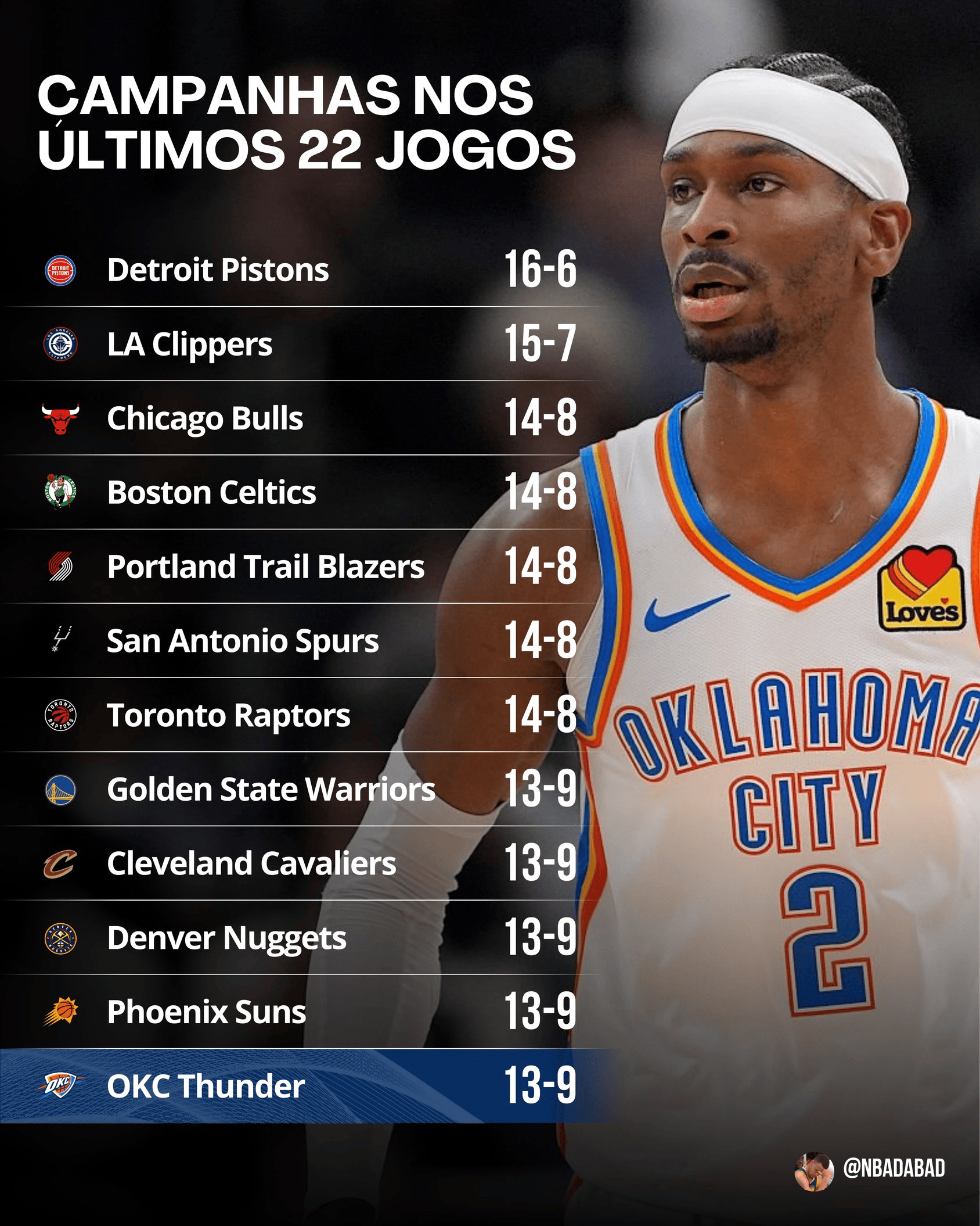 美媒分享数据:雷霆自从输给马刺后,过去22场比赛仅拿到13胜9负;