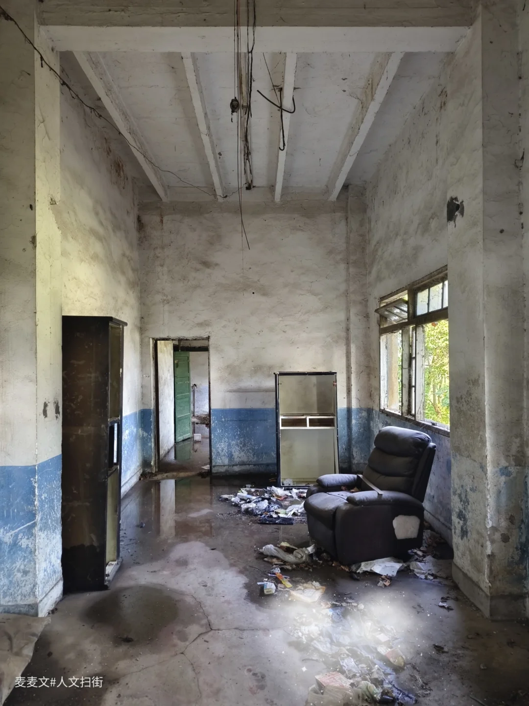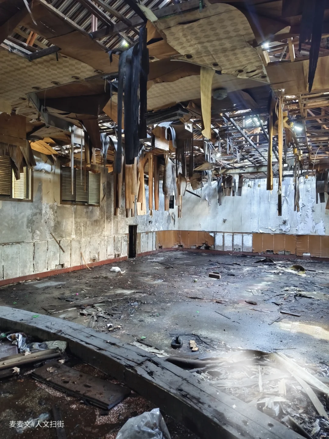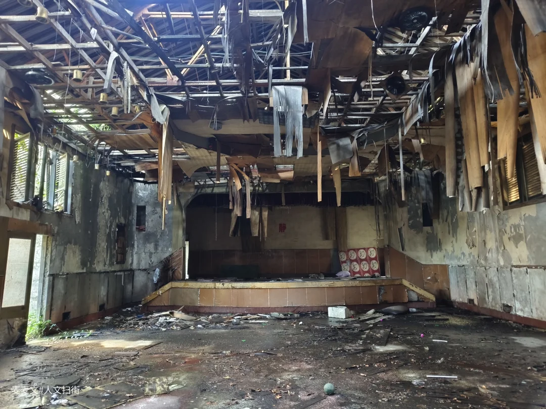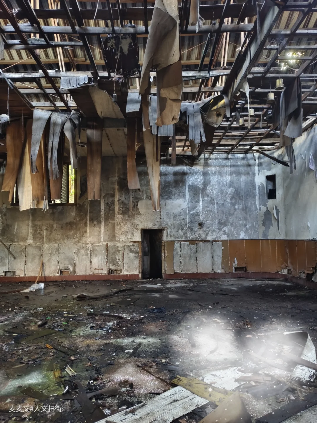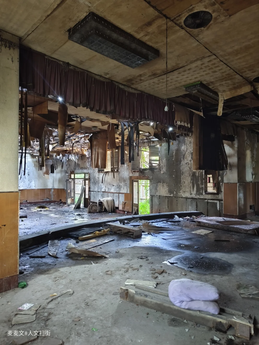 走进一座废弃的80年代某化工厂礼堂,往昔热闹不再。屋顶木板残缺不全,随风摇曳。墙面斑驳脱落,露出内里粗糙质地。舞台积满灰尘,装饰早已褪色。地面散落着杂物与碎屑,一片狼藉。曾经这里欢声笑语、人声鼎沸,承载着工人们的集体记忆,如今只剩荒芜,似在默默诉说着岁月的沧桑变迁。