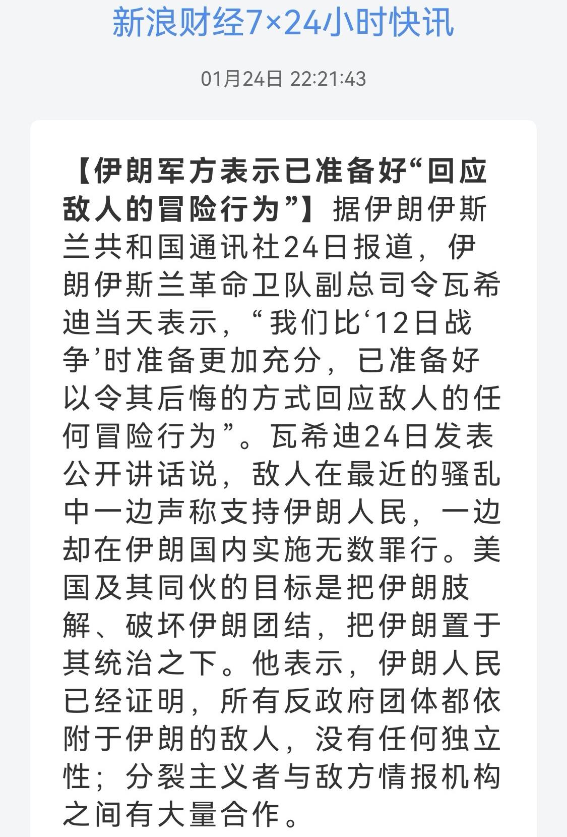 种下风者必收获风暴 特朗普称今晚有大事情 在美伊对抗中伊朗有胜算吗 美伊 央视新闻报道,当地时间1月23日,美国财政部外国资产控制办公室宣布,对与伊朗能源和航运体系相关的多家实体及船只实施新一轮制裁,重点指向协助伊朗石油、能源及衍生品出口的航运和管理网络。 制裁同时适用于由被列名实体直接或间接持有50%及以上股份的关联公司,进一步扩大了合规约束范围。美国从经济上继续向伊朗施压,扩大适用范围,给通胀高企、民愤层起的伊朗继续雪上加霜。 POLITICO传出,美国总统特朗普称:是时候寻找伊朗新的领导层了。央视新闻报道,当地时间20日,美军被曝由于美国与伊朗关系的高度紧张,正在加强在中东地区的空中力量。据悉,十多架F-15E攻击鹰战斗机18日从英国起飞前往中东地区;另有C-17环球霸王III运输机从英国飞往中东执行任务。美国中央司令部20日在社交媒体发文证实了F-15E的部署。军事上加快部署,航母编队、战斗机集结,为打击做准备,即使不动手,心理上的压力也是山大。 据法新社等媒体23日报道,美国总统特朗普称,白宫正调遣重兵前往伊朗,尽管他并不想动用这支舰队。他还称将对所有与伊朗进行贸易往来的国家加征25%关税的措施将很快生效。同日,伊朗伊斯兰革命卫队总司令帕克普尔警告称,伊朗军队已做好应对最坏情况的准备,已“随时准备扣动扳机”。警告美国和以色列不要采取此类冒险举动,并表示,伊朗的崩溃将直接导致该地区的崩溃,其中也包括以色列。伊朗伊斯兰革命卫队副总司令瓦希迪当天表示:我们比“12日战争”时准备更加充分,已准备好以令其后悔的方式回应敌人的任何冒险行为。伊朗反美宣传画﹣﹣波斯语和英语标语:“种下风者,必收获风暴。”(意为恶有恶报)。战斗之前或者说矛盾激化之前,言语上压制对手也可以提升士气。但实力不如对手,喊多了反而让人感到胆怯。 当地时间25日,乙方国防军北方司令部司令拉菲·米洛表示,鉴于地区紧张局势持续升温,乙军正为美国可能对伊朗采取军事行动后引发的连锁反应做准备,并已进入高度戒备状态。伊朗距美洲太远,以其实力还无法用洲际让美国忌惮,打击一下代理人才是上策,12日战争即是前车之鉴。川普急于结束俄乌冲突,也是抽出手来专心对付伊朗。为代理人出头,压住伊朗才能守住波斯湾这个能源要地。乙方就是帮美国守油田的! 矛盾之初来源于“伊核协议”,想一想如果让伊朗掌握大规模杀伤性武器,是何种情形?以前还是黎巴嫩、叙利亚、也门武装等等围成一圈火箭弹等骚扰攻击,如果武器升级,那美国就会在能源要地失去立足点。“弃核”就是基本要求,即使和平利用都不行,毕竟他会给你升级为武器打下良好的基础。 12日战争,有点仓促。打击重点核设施,漏网之鱼显然。时日已久,情报搜集,内线部署,军事力量集中,准备充分。川普已经喊出:是时候寻找伊朗新的领导层了,图穷匕见。不换领导层,必须完全弃核,也可以和平;要不就是,充分利用这次内部矛盾,加上军事打击,促使政权更迭,复制一个“听话的小绵羊”,这样中东能源要地重归一统,都听美国的。 而伊朗心存侥幸,仍认为就像上次一样有限打击,还在喊口号让对方小心出手。这一次真的不一样,上一次导弹、防空武器库存用光,为了这次肯定储备加倍。军事加上国内矛盾,他已经准备像委内瑞拉一样换首领。 (图片源自网络侵权告知删除)