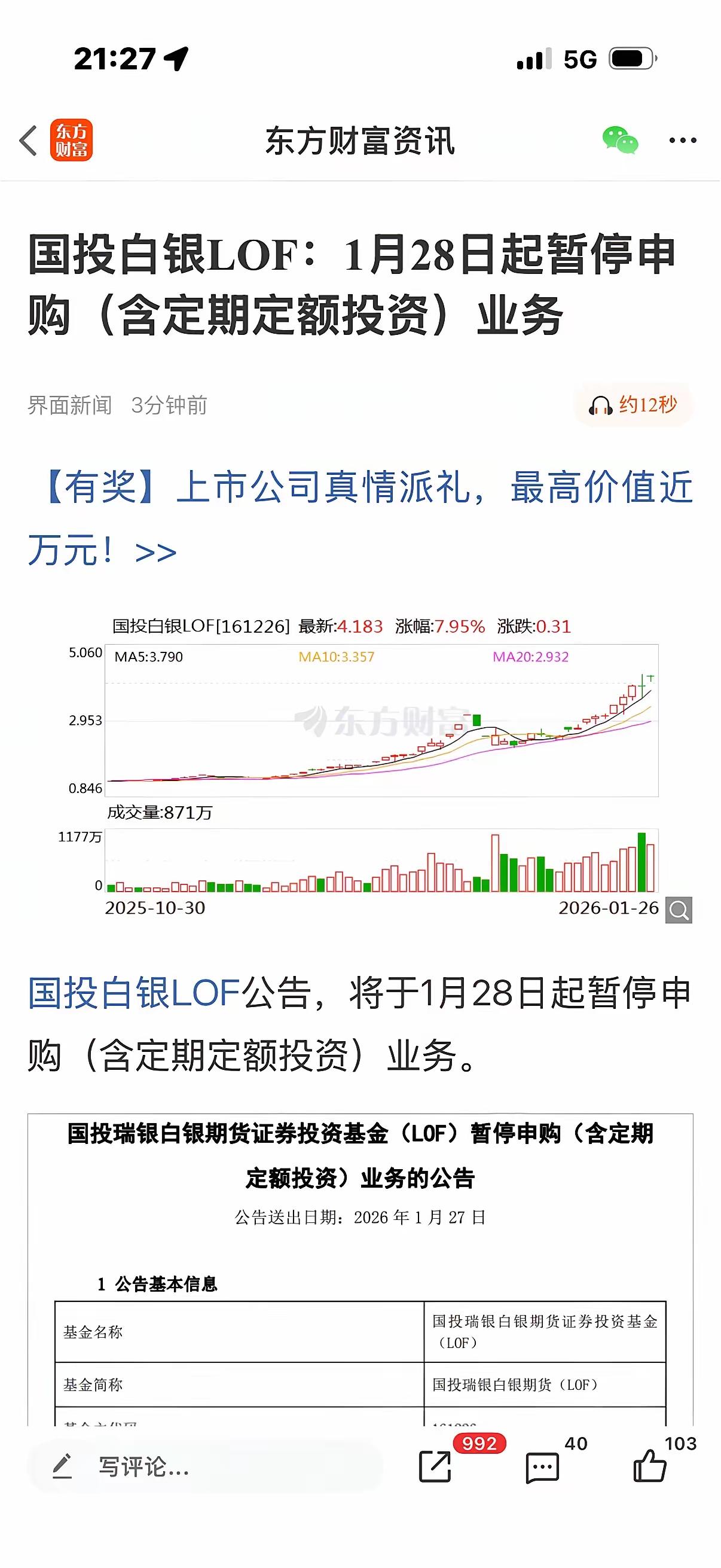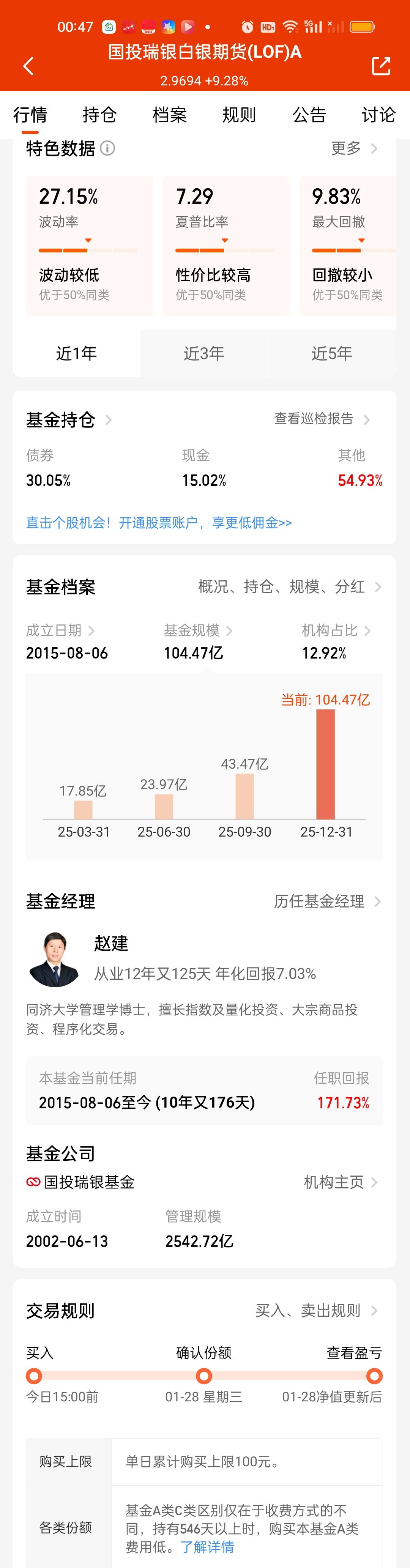 这只基金的表现太恐怖了,暴涨9.28%强势拿下今天的收益榜第一。近1年的收益率更是达到了恐怖的230.08%,甚至还远超25年年度收益总冠军永赢科技智选。基金规模更是呈现几何级增长,其实这只基金的限购一直在进行,从单日限购500再到限购100,然后又从1月28日起开始彻底不让买了。现在还在车上的无疑是最幸福的。而且是稳稳的幸福。已经卖出的估计要哭晕在厕所了。