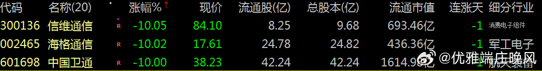 【财富晚茶】蛟龙携款逃逸:01.26收盘主力:资金净流出前20股票导语:作者系《网易号》优质财经领域创作者。曾经原创作者和知名网易号旅游领域创作者。大跨度行业等的写作,颇受网友喜爱。作品发表于2026.01.26.23:58 优雅端庄晚风。【内容概述】今日股市收评:主题是:【财富晚茶】蛟龙携款逃逸:01.26收盘主力:资金净流出前20股票。主旋律:今日主力资金:净流出前20股。蛟龙见顶劫款兑现:且战且退落袋为安。一、视野最新:资金涌出谁在杀跌300136 信维通信 002465 海格通信 601698 中国卫通1、风险公司:高位杀跌第一、300136 信维通信靓丽底牌:射频领域多赛道的龙头。天线与无线充电龙头。卫星通信“隐形冠军”。车载天线与互联产品龙头。第二、002465 海格通信靓丽底牌:军用无线通信导航装备最大整机供应商。中国空天信息领域的龙头企业。第三、601698 中国卫通靓丽底牌:中国卫星通信领域的龙头企业。国内卫星通信运营龙头。国内卫星通信运营龙头。卫星互联网产业龙头。二、主力资金:谁在携筹兑现出逃1、600879 航天电子收盘价:28.32元。涨跌幅:-9.98%。净流入: -38.16亿2、600118 中国卫星收盘价: 98.01元。涨跌幅:-10.00%。净流入: -25.95亿3、300136 信维通信收盘价:84.10元。涨跌幅: -10.05%。净流入: -18.59亿4、002050 三花智控收盘价: 51.94元。涨跌幅:-3.89%。净流入: -17.72亿5、002202 金风科技收盘价: 28.40元。涨跌幅:-3.99%。净流入: -17.69亿6、601012 隆基绿能收盘价: 19.09元。涨跌幅: -1.34%。净流入: -15.87亿7、601212 白银有色收盘价:11.41元。涨跌幅: 10.03%。净流入: -14.03亿8、002156 通富微电收盘价:51.80元。涨跌幅: -8.06%。净流入: -13.81亿9、300433 蓝思科技收盘价: 38.93元。涨跌幅:-8.62%。净流入: -12.82亿10、002475 立讯精密收盘价: 54.09元。涨跌幅: -2.54%。净流入: -11.74亿11、002465 海格通信收盘价:17.61元。涨跌幅:-10.02%。净流入: -10.58亿12、5300750 宁德时代收盘价: 342.05元。涨跌幅: -1.43%。净流入: -10.26亿13、601698 中国卫通收盘价: 38.23元。涨跌幅: -10.00%。净流入: -9.71亿14、300058 蓝色光标收盘价:20.74元。涨跌幅: 0.92%。净流入: -9.28亿15、000066 中国长城收盘价: 17.23元。涨跌幅: -5.80%。净流入: -9.07亿16、300102 乾照光电收盘价:42.52元。涨跌幅: 8.55%。净流入: -8.97亿17、300724 捷佳伟创收盘价 131.61:元。涨跌幅: -1.86%。净流入: -8.90亿18、000547 航天发展收盘价:26.48元。涨跌幅: -9.99%。净流入: -8.86亿19、000630 铜陵有色收盘价:7.55元。涨跌幅: 10.06%。净流入: -7.96亿20、002195 岩山科技收盘价:9.98元。涨跌幅: -5.04%。净流入: -7.68亿三、视野背景:短中长期调仓换股追击杀跌:原形毕露:2026年1月26日收盘时,航天、军工板块等板块出现下跌,主要因市场情绪、资金流动、部分个股利空共同作用的结果。1、市场风险:偏好降低当日A股三大指数集体收跌,量能虽维持在3万亿以上高位。市场风险:偏好明显下降:导致前期热门题材股出现获利回吐和资金撤离。例如商业航天、军工装备、半导体、机器人等高弹性板块成为调整重灾区。2、宏观流动:收紧预期流动性预期变化:部分市场分析认为,宏观层面流动性收紧的预期对高估值、高Beta属性的军工和航天板块形成压力。此前央行官员的发言被市场解读为未来货币政策可能趋于中性,影响了资金对高波动板块的偏好。3、个股利空:是否影响部分军工:概念个股因涉嫌违规被证监会立案调查。引发市场:对相关领域监管趋严的担忧,加剧了板块的恐慌情绪。第一、今日信息天普股份公开信息:1月26日:天普股份因公司股票交易异常波动公告涉嫌重大遗漏,中国证监会于2026年1月9日决定对公司进行立案调查。第二、追寻信息天域生物公司实际控制人、董事长罗卫国因涉嫌违规减持公司股票,于2025年12月31日收到中国证监会的《立案告知书》,并于2026年1月6日辞去相关职务。第三、短期脉冲涨幅异常2026年1月26日当天,锋龙股份和嘉美包装因股价短期内涨幅异常,被证监会启动停牌核查程序,但公开资料未明确提及“立案调查”,而是属于核查阶段。4、技术调整:转低估值商业航天等题材在前期经历了快速上涨,部分个股涨幅巨大,存在技术性回调需求。资金从高位个股流出,转向其他相对低位或更具基本面支撑的板块(如黄金、油气、保险等)。四、本创作品:优质财金网易作者投资投机迷茫之中:给予尽可能有帮助:资本市场风险自负。(优雅端庄晚风《网易号》财经领域创作者和原创作者 违者必究)