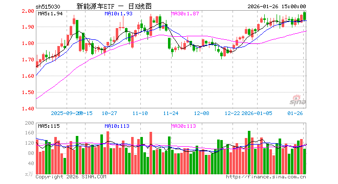 1月26日,新能源车ETF(515030)跌1.47%,成交额1.91亿元。当日份额增加400.00万份,最新份额为22.11亿份,近20个交易日份额减少1.90亿份。最新资产净值计算值为42.78亿元。