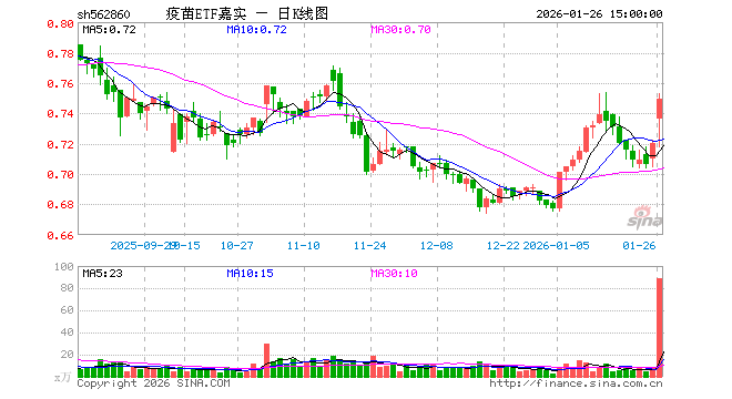 1月26日,疫苗ETF嘉实(562860)涨4.03%,成交额6650.49万元。当日份额增加7400.00万份,最新份额为3.93亿份,近20个交易日份额增加5600.00万份。最新资产净值计算值为2.93亿元。