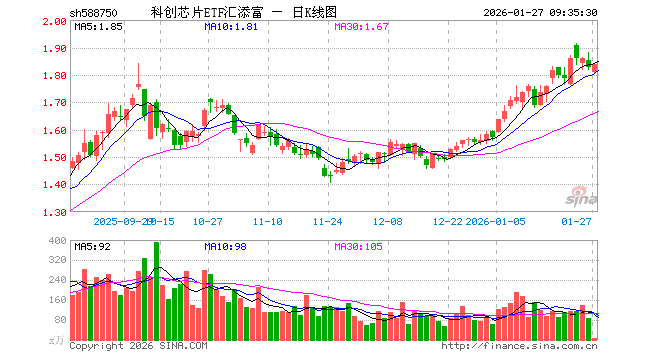1月27日,科创芯片ETF汇添富(588750)开盘跌1.15%,报1.807元。科创芯片ETF汇添富(588750)重仓股方面,中芯国际开盘涨0.07%,海光信息涨0.50%,寒武纪涨0.00%,澜起科技跌1.21%,中微公司涨0.22%,拓荆科技跌0.03%,芯原股份跌0.00%,华虹公司跌0.89%,沪硅产业跌0.09%,东芯股份涨8.07%。