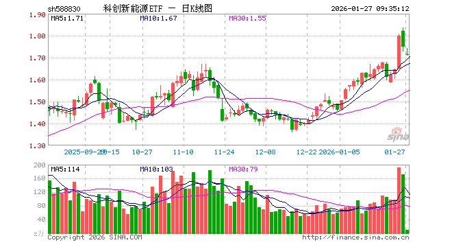 1月27日,科创新能源ETF(588830)开盘跌1.89%,报1.715元。科创新能源ETF(588830)重仓股方面,晶科能源开盘跌1.35%,阿特斯跌0.64%,天合光能跌0.87%,容百科技涨0.81%,大全能源跌0.58%,厦钨新能跌0.78%,嘉元科技跌1.49%,天奈科技跌0.45%,孚能科技跌0.70%,固德威跌1.89%。