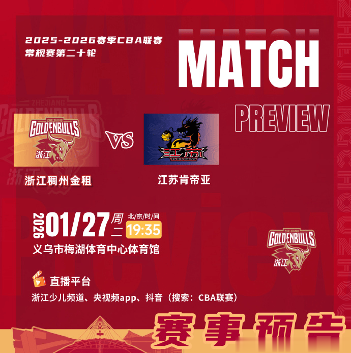 虎扑01月27日讯今日CBA常规赛:浙江男篮将对阵江苏男篮。