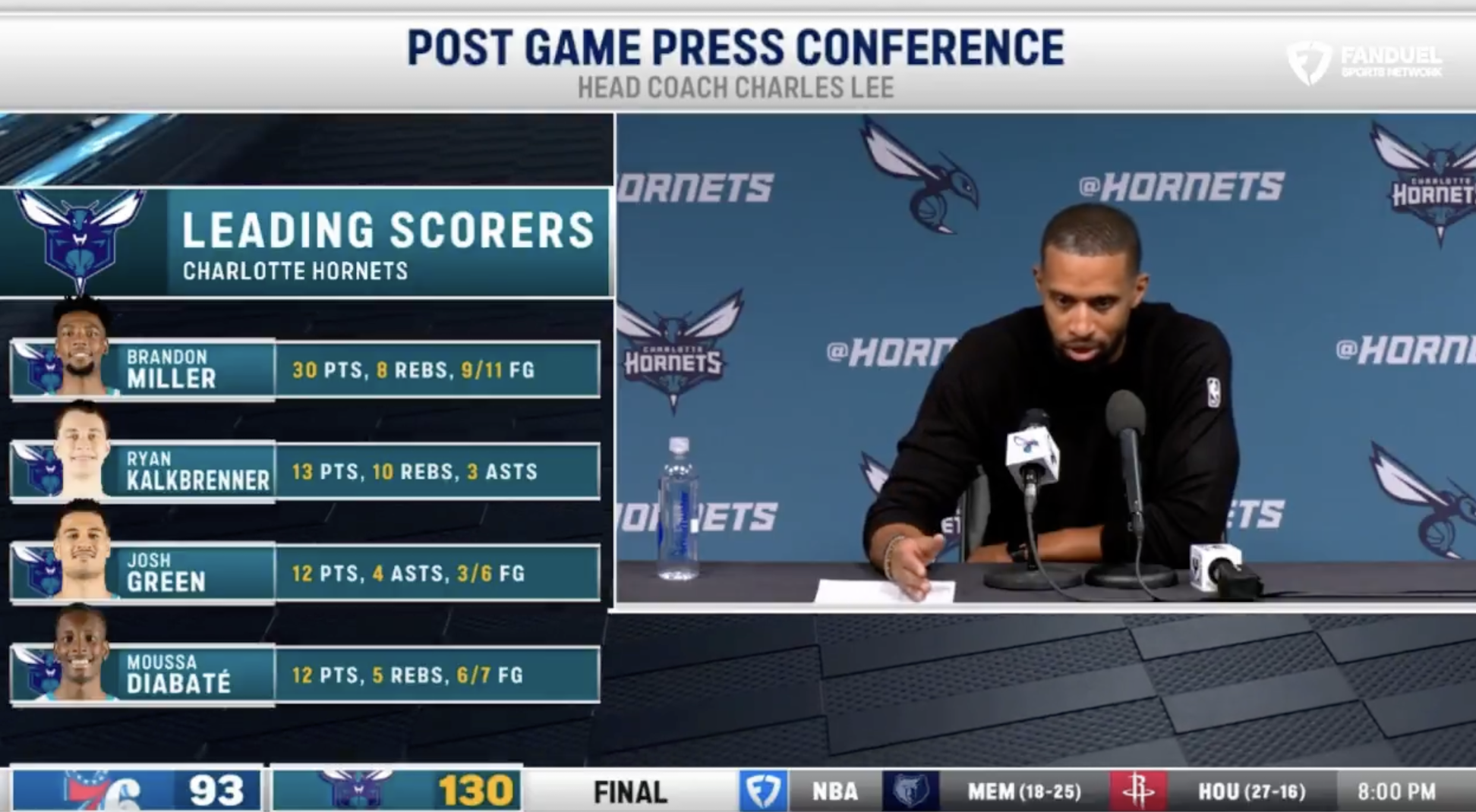 赛后黄蜂主帅查尔斯-李接受了记者采访,谈到了球队本场的表现。