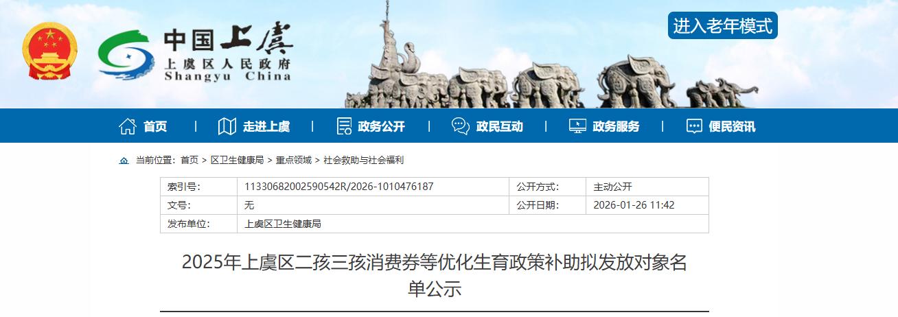 近日,绍兴上虞区人民政府发布一则《2025年上虞区二孩三孩消费券等优化生育政策补助拟发放对象名单公示》。