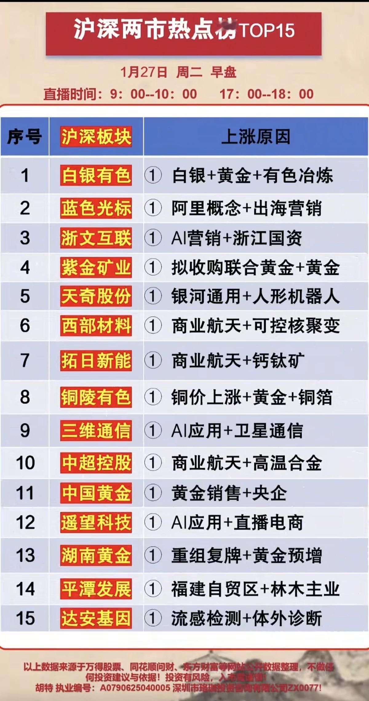 1.27周二 人气股热榜+主力资金抢筹榜 1.黄金白银+有色冶炼 2.卫星通信+AI应用 3.人形机器人 4.有色金属铜 5.流感检测
