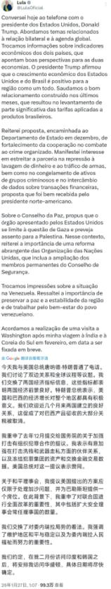 巴西总统卢拉今天(北京时间1月27日)发文写道:“今天我与美国总统唐纳德·特朗普通了电话。我们讨论了双边关系和全球议程等议题。我们交换了两国经济指标信息,这些指标都表明两国经济前景良好。特朗普总统表示,美国和巴西的经济增长对整个地区都具有积极意义。我们欢迎近几个月来两国建立的良好关系,这促成了对巴西产品征收的大部分关税被取消。 卢拉和特朗普今天的通话,藏着拉美最大经济体的深呼吸。去年巴西经济刚跑出3.4%的增速,是四年来最高,可成绩单背后全是磕绊——美国去年8月突然甩出50%的惩罚性关税,巴西咖啡出口当场被砍半,东北部海鲜船队直接停摆,连橙汁副产品都被波及。 现在特朗普说“大部分关税取消”,对巴西农民来说,相当于田里的作物突然又有了销路。 这种转变来得不容易。去年卢拉刚重启对话时,美国还拿着“博索纳罗受迫害”的理由卡着关税,巴西咖啡商不得不转头找德国接盘,硬生生把欧洲客户的订单量顶上了第一。 现在关税松动,不是美方突然心软,而是巴西2024年3.4%的增长背后,藏着拉美最大的消费市场——去年巴西贸易销售额连涨八年,75%的老百姓看好今年经济,这种内需潜力,正是美国企业不想错过的蛋糕。 电话里提到的“经济指标交换”很实在。 巴西刚搞完“新工业计划”,农业链优化、绿色基建这些动作,正好对接美国低碳经济的需求;而美国通胀压力下,巴西的牛肉、豆类进口关税已经降到零,双方都在算务实的账。 就像卢拉去年启动的“巴西主权计划”,一边给受关税冲击的企业发300亿贷款,一边悄悄开拓亚洲市场,但能直接砍掉关税壁垒,显然更解渴。 最微妙的是委内瑞拉议题。卢拉强调“拉美和平”,背后是去年委内瑞拉6.2%的经济反弹——这个曾萎缩的国家突然回血,对整个南美供应链都是利好。 美国在拉美搞的“和平委员会”,原本想拉巴西入伙,现在卢拉只松口“处理加沙问题”,还要求给巴勒斯坦席位,摆明了不想当美国的地区警察,而是要以经济合作为主轴,把拉美稳定攥在自己手里。 接下来的2月访美是关键。巴西刚和南方共同市场谈永久减税,又在对接欧盟自贸协定,现在美国关税松绑,相当于同时打开三个方向的市场。 但卢拉心里清楚,去年德国能接住咖啡,今年中国能吃下更多牛肉,这种贸易多元化才是底气。 就像东北渔民不再只盯着迈阿密港口,开始研究如何把金枪鱼卖到上海,大国之间的博弈,最终都要落在老百姓的菜篮子上。 这场50分钟的通话,没有一句空话。特朗普需要拉美稳定的资源供应,卢拉需要美国市场的真金白银,双方都在算经济账。 当巴西农民发现运往美国的牛肉卡车重新启动,当东北部的海鲜又能登上美国超市货架,这种务实的互动,比任何政治表态都更能稳住拉美最大经济体的阵脚。 毕竟在全球通胀的大环境里,能多卖一吨咖啡,就能多保住一个家庭的饭碗。