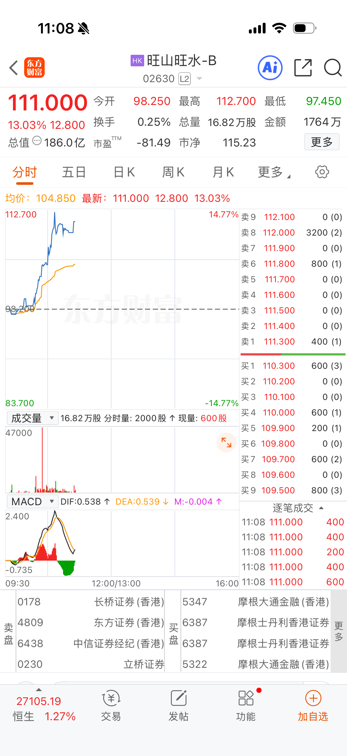 上证报中国证券网讯(记者何治民)1月27日,旺山旺水-B震荡走强,一度涨超14%。截至11时08分,该股涨13.03%,报111港元/股。