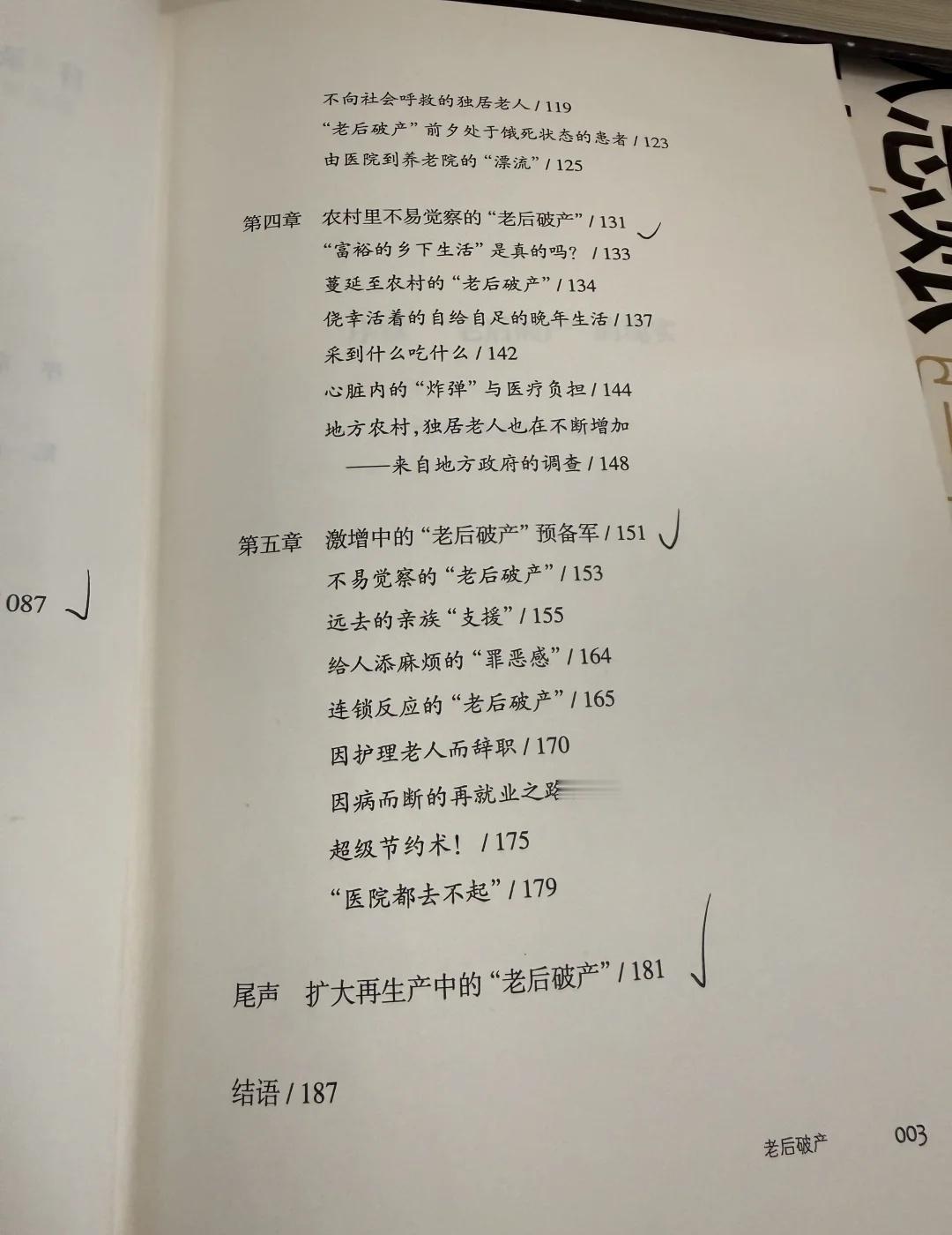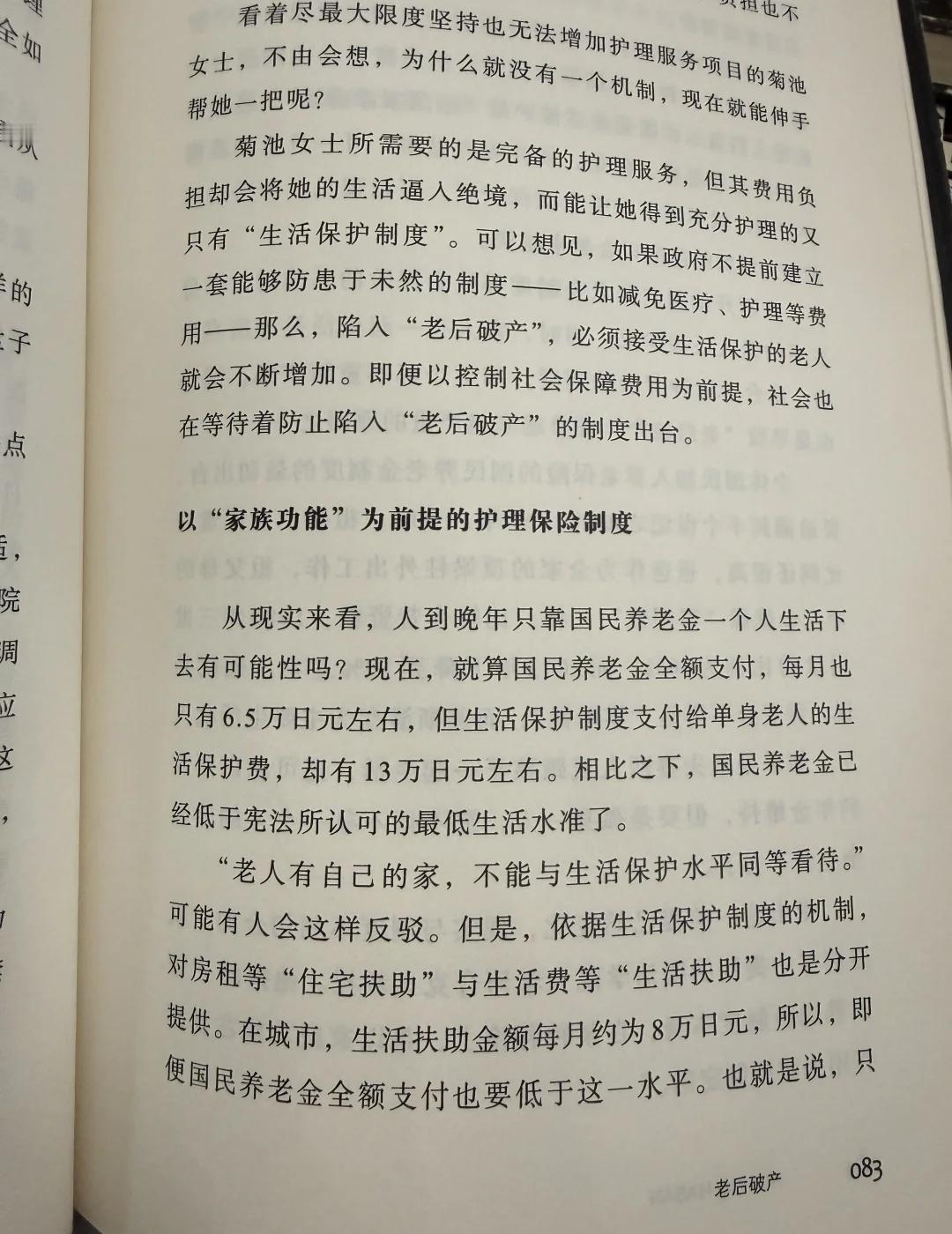 心情沉重地看老后破产 这个书的副标题是名为“长寿”的噩梦。 很贴题。 这个应该是日本NHK电视台的纪录片编著而成的一本书,刚开始给我们科普了一下日本养老的结构,一般是由国民养老金为主的,还有社会养老金为补充,这个是由企业正式员工享有的。 如果养老金低于最低水平,会有生活保护费,保护费的申请会有一定的限制,比如存款低于多少或者是没有存款,没有亲属和家人以及名下没有住房,或者自有房产价值极低的老人。 前两章讲的是没有自己住房的老人,他们的主要支出是房租+医疗+护理+日常和饮食。因为老年人身体机能逐渐减退,都会有行动不便,腰腿疼痛或者风湿类的疾病,这两位老人尤甚,一个是断了电费,黑灯瞎火的开着门吃凉面,一个是需要靠步行器起床,两个月才能由护理陪同出一次门。 日本护理是要交护理保险的,交了护理保险护理费用可以抵扣,到十分之一的份额;断交两年就会升至十分之三。护理一共分为五个等级,根据内容和时常会增加费用。 老人经常在不得不花存款,花了存款担心自己没有着落(但是可以领保护金),以及担心没着落越是不敢花钱,每天的餐饮预算从一百日元到去河边捞鱼摘野菜,看到什么吃什么。 第三章节的老人年轻时候是个出色的木匠,自己的家是由自己亲手建造,所以这个陪伴了自己50年的地方他是无论如何也舍不得卖掉的,但是相应的不敢去领取保护金,其实老房子价值已经很低,但是因为没有钱也逐渐没了社交和相熟的朋友,信息上也落后很多。 其中的一个阿姨也典型,是被兢兢业业干了35年的企业骗了,没有交社会养老金,只能靠2w5的日元度日,还有心力衰竭,出门要拖着一个五公斤重的呼吸仪器。 这些都是城市的老人,农村的老人即使守着家,也会陷入越种地赔的越多的循环里,又舍弃不掉耕种了一辈子的农田。 看完真的是对养老的焦虑多了几分,最近半年没有上班,看完还有了隐隐的愧疚感,觉得虚度了最能挣钱的年龄。自己也不上不下,完全没有下一步的规划。 我还找到了下一本,老后两代破产。讲的是为了贴身照顾生病的老人的中年人放弃工作,再也难以回到职场的处境。那篇的视角可能会给我更多代入感,可能也会让我更慎重地在工作和生活上做个平衡。 阅读记录 老后破产