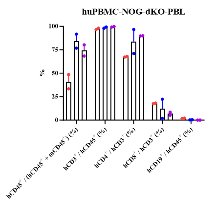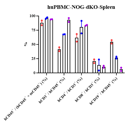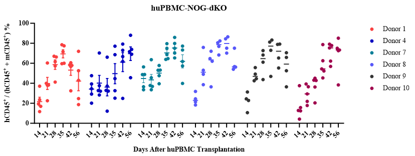 3)huPBMC-NOG-dKO模型GvHD大大减缓,减少非特异性T细胞扩增的干扰,实验窗口期长(8-12周);