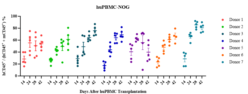 1)huPBMC重建模型:PBMC供体经过预筛选和重建验证,可锁定供体,持续供应;