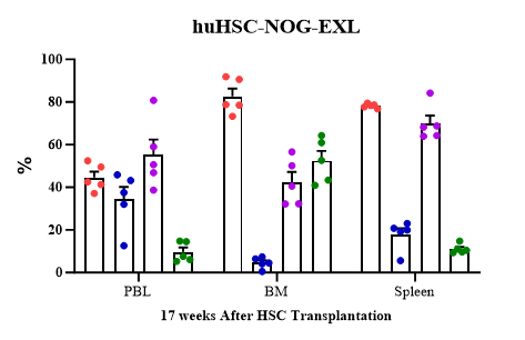 机制:NOG-EXL小鼠辐照后静脉注射CD34+HSC,重建多谱系、长期稳定的人源免疫系统。