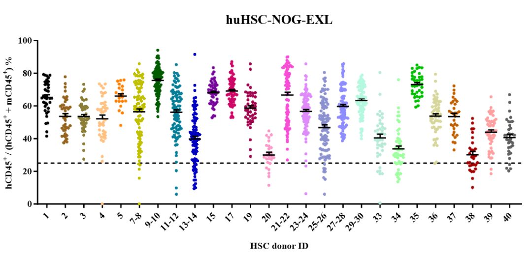 2)huHSC-NOG-EXL模型:每只小鼠均进行免疫重建验证,可提供HSC移植后7周末的流式验证数据,保证hCD45+(%)>25%;