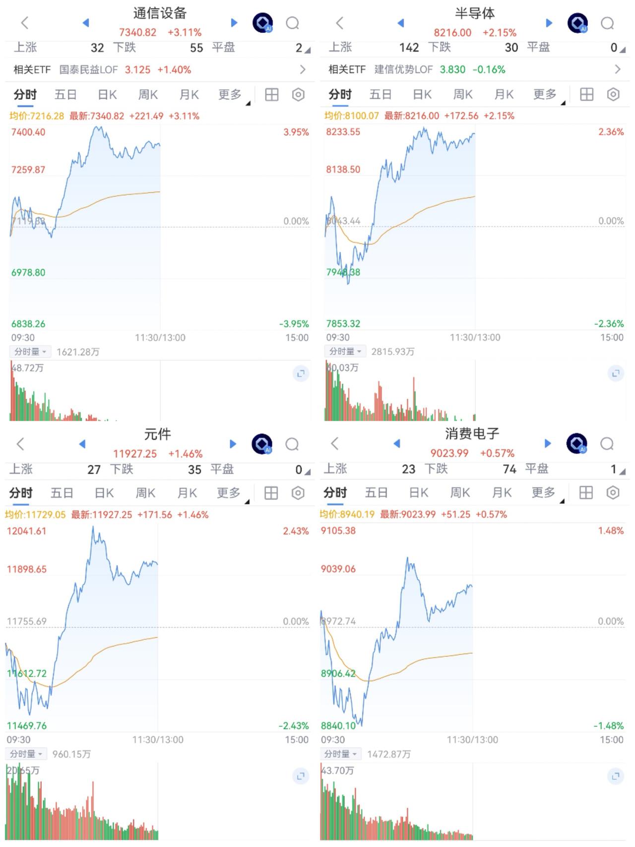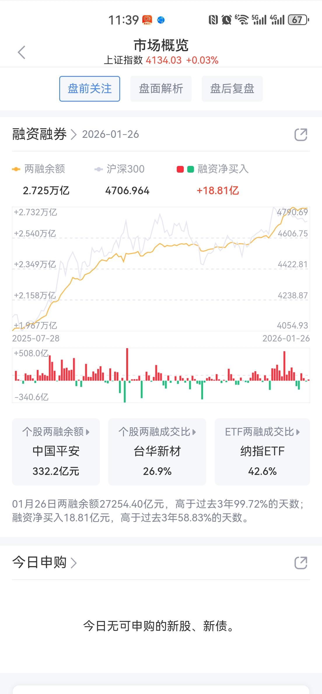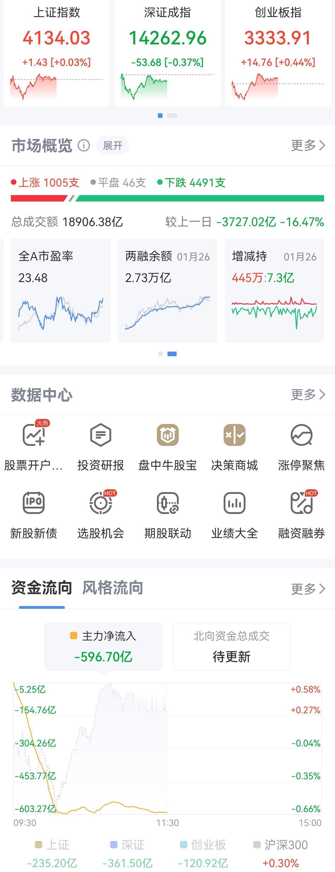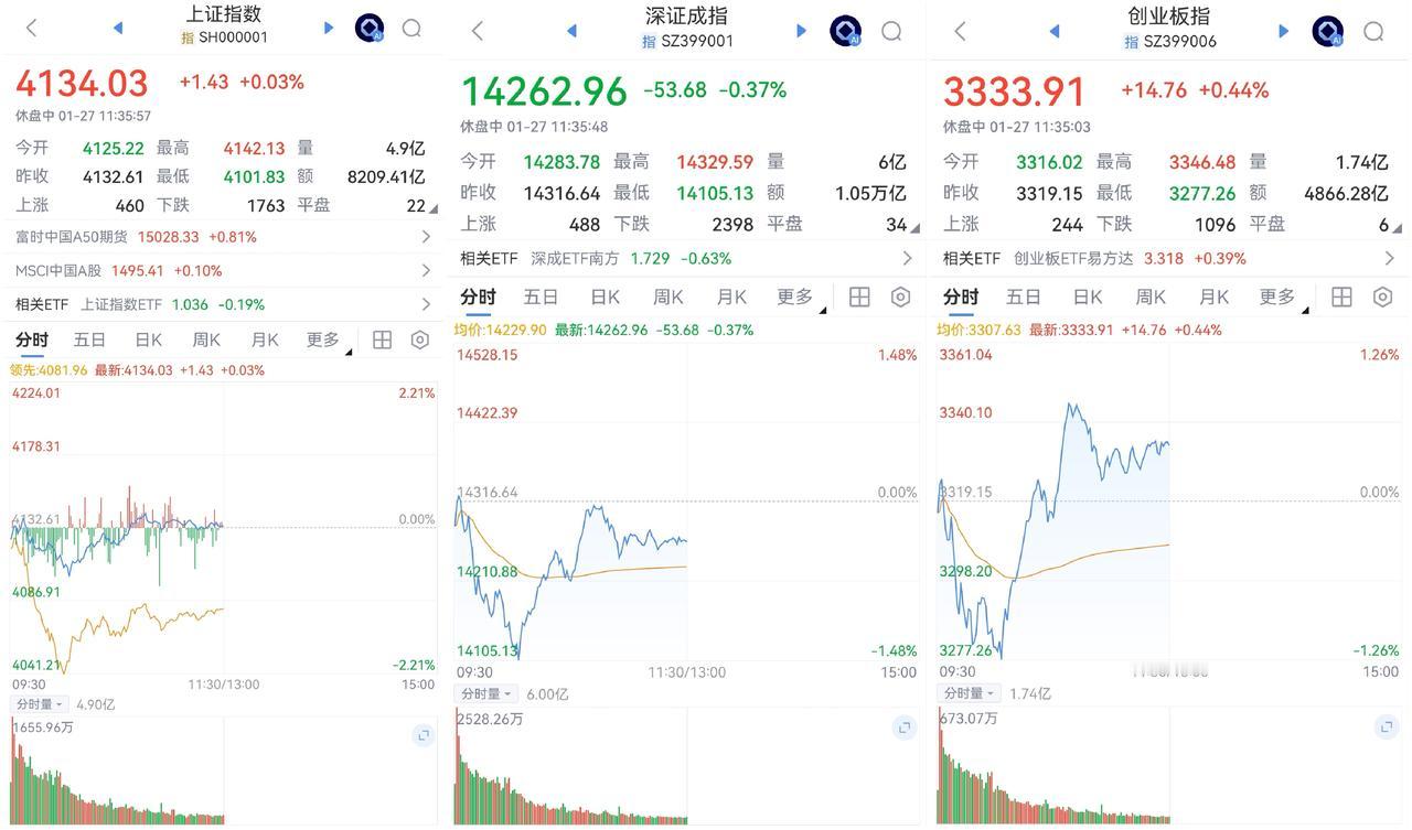午盘印象(1月27日) 二八行情 个股仍低迷 外围:美股收涨 科技分化 影响正面 内股:科技止跌回升 红利回暖 指数震荡 一、三大股指开绿: 指数开盘稍弱 个股开盘涨平跌比率23%:13%:64%。 个股开盘极弱(-41 Vs +10个百分点), 远逊于上个交易日, 二、指数跳水又回升 AI硬件带领科技回暖,红利也回升 半日交易1.87万亿,量能大减 权重支撑盘面 三、涨跌幅榜: 科技回暖,红利回暖 跌幅前列:新能源、消费 涨幅前列:AI硬件、红利、AI应用 四、开盘和午盘: 开盘:沪-0.18%、深-0.23%、创-0.09%。 午盘:沪+0.03%、深-0.37%、创+0.44%。 跳水又V起,宽基ETF暂停调控 五、午盘个股上涨29%,不足三成,与昨日涨跌差距(-39 Vs -39个百分点),相差无几 相比开盘,跌涨差变化不大,下跌个股稍减 净流入 -597 (-845)亿,资金巨幅流出但稍许改善 六、沪深两市成交量午盘18,734亿,上个交易日22,408亿,同比量能大幅萎缩近3,700亿,缩量探底回升。 七、指数自我修复,量能萎缩 融资额前日微降-14亿,昨日微升+19,调控坚定,降杠杆成效明显。 午后两种情形: 1、横盘震荡:时间换空间,震荡消化获利盘,主要看量能。 2、震荡上行:主要看科技回暖程度,波动上下,慢牛格局不变。 (图片源自网络侵权告知删除)