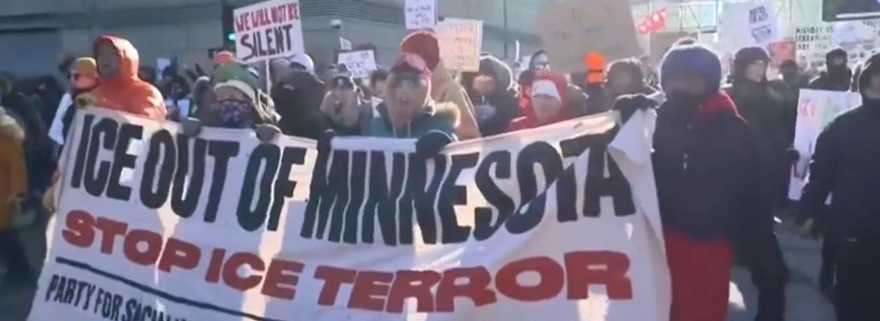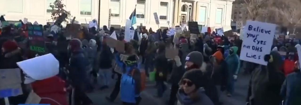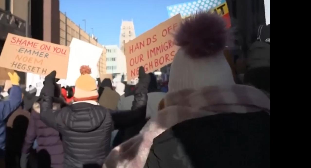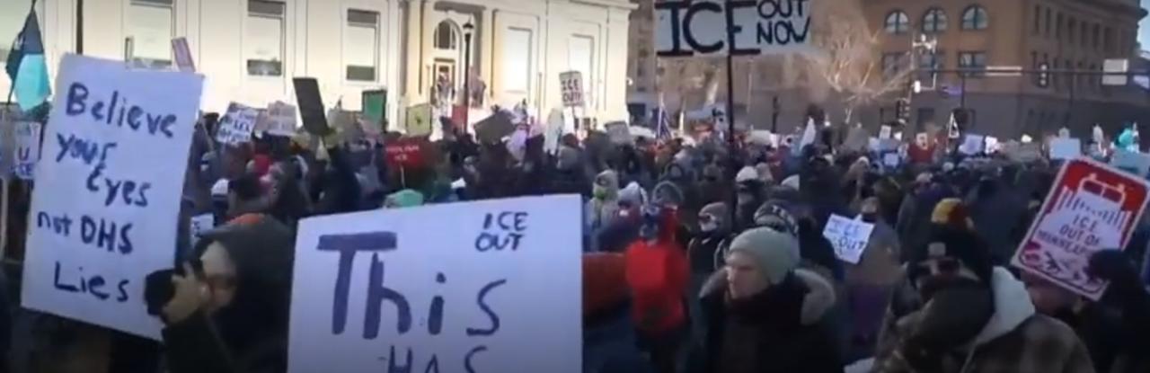 美国明尼阿波利斯街头,民众冒着严寒走上街头,高举“停止杀害我们的邻居”“ICE滚出明尼苏达”等标语,抗议联邦执法人员暴力执法,声援在执法中死亡的移民亚历克斯。人群从市中心街道蔓延至市政厅前,呼喊着反对边境暴力与移民执法的口号,要求为受害者伸张正义,也让美国移民执法的争议再次升温。
