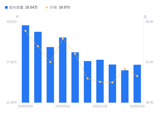 日期A股户数(户)流通A股户均持股数(股)户均持股市值(万元)2026-01-092581776724.8127.592025-12-102666426509.9025.392025-11-282737186341.6124.792025-11-202718776384.5525.282025-11-102849156092.3926.362025-10-313068815656.3125.742025-10-202926405931.5724.932025-10-103153415504.5624.432025-09-303250725339.7824.932025-08-291920408995.7132.81