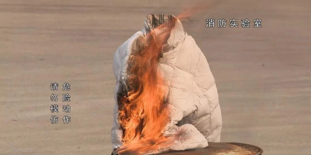 有实验表明,将羽绒服穿在假人模特上并拉上拉链,用打火机在衣角一点,羽绒服立马窜出火苗,不到5分钟就被烧得只剩熔化的拉链。如果此时接触到含有油脂的皮肤,其燃烧速度可能会更快。