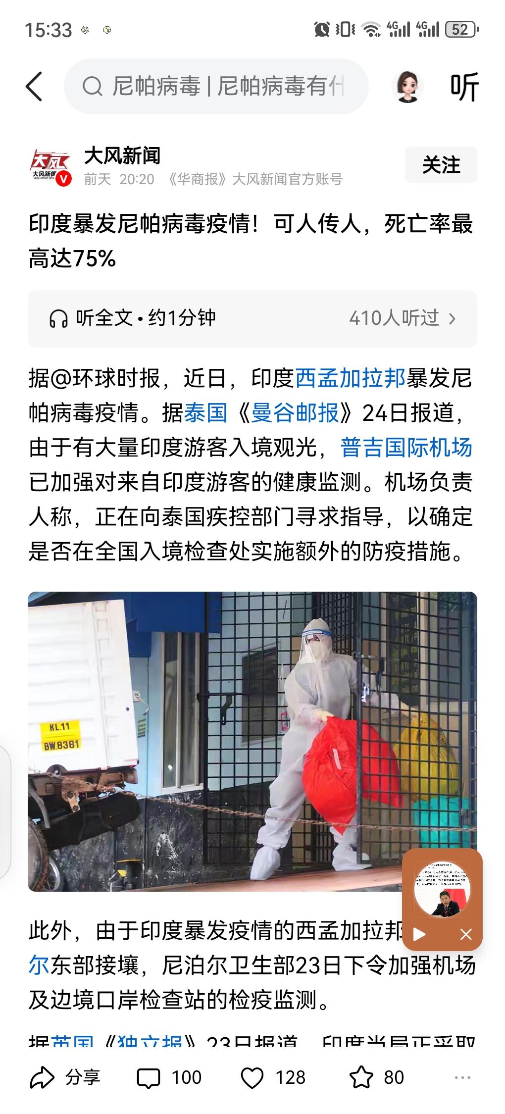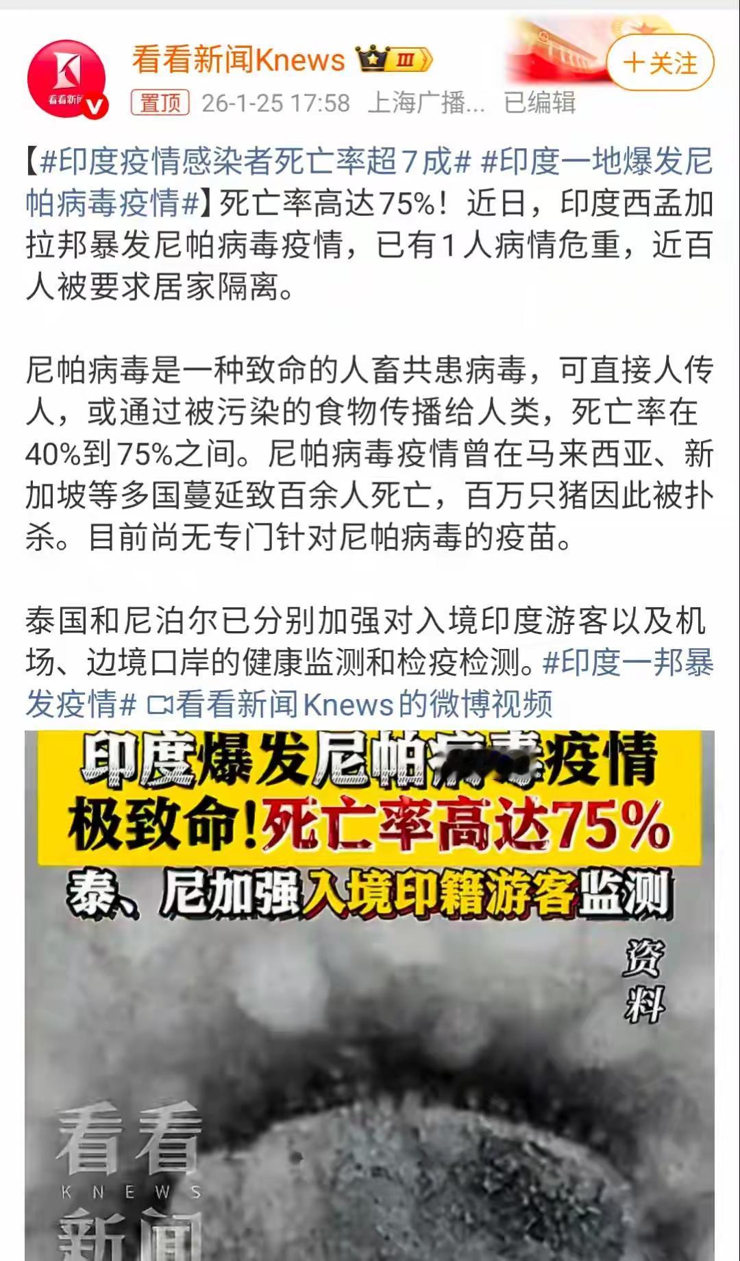 咱就不能把印度人进入国家的这个门给关了吗? 死亡率高达75%的新型病毒出现,还赶上咱们国家大过年的好日子。 根据新华社的权威消息,印度出现了一种叫做尼帕病毒的疫情,由于这种疫情的死亡率高达40%-75%,而且可以通过人畜以及人人传播,且目前尚无特效药,所以印度周围的邻国都“严阵以待”。 比新冠还厉害!如果入侵我们,将是人类的灾难!应放在重中之重,高度警惕。 根据世界卫生组织的统计数据显示,自2001年以来,孟加拉国几乎每年都有人感染尼帕病毒并死亡的病例报告,死亡率为60%至90%。 4-14天的潜伏期,最长可达45天。作为世卫组织认定的致命人畜共患病,它主要由果蝠携带,可通过污染食物传播,还能直接人传人,40%到75%的致死率远超普通传染病,更棘手的是,其潜伏期短则4天,最长可达45天,这让病毒的排查和防控难度大幅提升,而目前全球范围内,既没有针对该病毒的专用疫苗,也缺乏有效治疗手段,一旦扩散,后果不堪设想。 减少印度入境签,印度入境需要隔离一个月再入境。隔离费用自己掏钱。 越南,印度,日本这几个阾国相继发生疫情,中国要高度重视了,这不是非典那么简单,也许比之前抗了三年的新寇还严重,守好国门,等于守护国人生命。 尼帕病毒得了以后非常麻烦,因为病情进展比较快,病死率在40%-75%左右。而且作为病毒,目前人类尚无特效药,也没有出现获得许可的疫苗,所以得病以后再治疗是没啥效果的,只能靠人体自身的免疫力硬扛。 目前大量印度人来我国,我有关部门一定要重视本国人民的健康安全,快速采取有效措施防止病毒在国内犯烂,不能让武汉的悲剧重演! 中国驻印度大使馆,立刻停止签证,别再放人进来了。中国必须要在所有的中国机场和海关卡建立核酸检测隔离点。 面对尼帕病毒,我国既要筑牢“入境筛查+动态监测”的防疫屏障,也得给公众递上“科学防护指南”——比如提醒避免接触不明动物、生熟分开,用“硬核防控+暖心科普”,护好大家的健康。 不要像新冠病毒一样,全世界传染,到处隔离,年将至过个年又不太平,赶紧采取措施,不然全国人民又遭殃。 三哥都顶不住的病毒 那要是传过来了 直接死亡率达到百分之95。中印边境上的人民子弟兵要做好防卫,尽量不要和印度士兵接触,生命安全最重要!!! 连印度人都抗拒不了的病毒,那可不是开玩笑的。一般的病毒对印度人是没用的,他们是经过千锤百炼。那这个病毒是相当危险的。 呼吁我们的政府立即采取措施,严防病毒进入我国,一但进入我国,再防就被动了,代价也更大了。