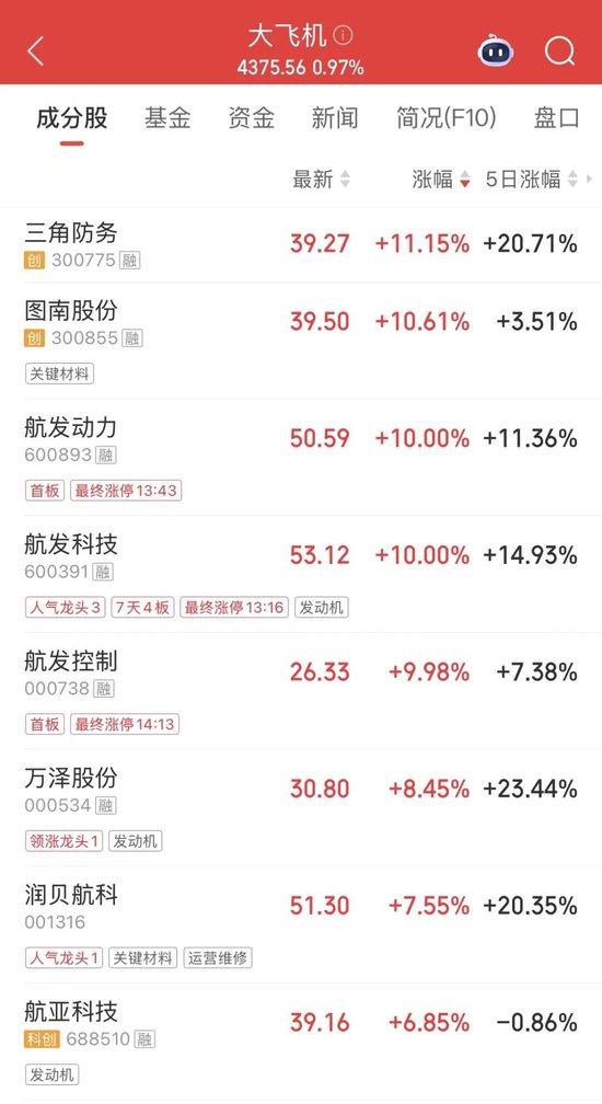 午后大飞机概念走强,商业航天概念回升。截至收盘,航发控制涨停;航发科技直线涨停,走出“7天4板”,收报53.12元/股,最新市值为175.36亿元。