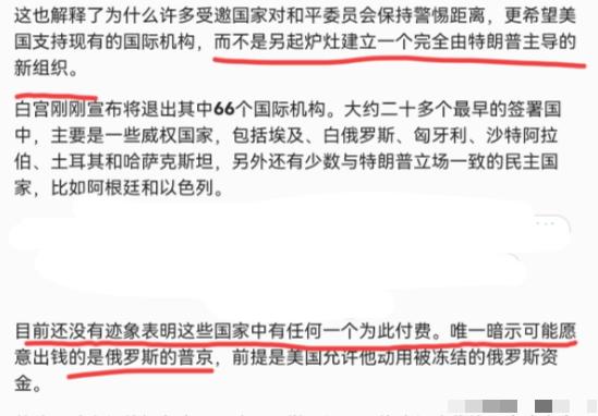 特朗普估计懵了!没想到那些加入“和平委员会”的国家算盘打的那么精! 1月27日,根据外媒报道,虽然大约有二十多个签署国,包括埃及、白俄罗斯、匈牙利、沙特阿拉伯、土耳其和哈萨克斯坦等宣布加入“和平委员会”,但是截止到目前为止,却没有任何一个国家表态要为此付费10亿美元,而唯一暗示可能愿意出钱的是俄罗斯的普京,前提是美国允许他动用被冻结的俄罗斯资金。 外媒表示,大多数国家只是选择低调观望,而美国的盟友们则避而远之。 外媒表示,特朗普设立的“和平委员会”,看起来过于荒唐。 所谓的“和平委员会”根本不是什么纯粹的国际和平机构,而是特朗普量身打造的“私人政治俱乐部”。 章程里的规矩:普通成员国任期不超过3年,而一次性掏10亿美元现金的国家,能拿到不受任期限制的“永久席位”,权力还高度集中在特朗普手里,他一人掌握成员任免、议程批准和僵局裁决的大权,这哪里是和平机构,分明是用金钱买话语权的“霸权工具”。 那些点头加入的国家,心里都有自己的小九九,没一个是真心冲着“掏10亿美元换和平”来的。 看中东国家,沙特、土耳其、卡塔尔这些国家,加入本质是想在加沙战后重建中占得先机,拿到更多能源、基建领域的合作份额。 就拿沙特来说,既想巩固自己在中东的影响力,又不想得罪美国,加入能给足特朗普面子,可真要掏出10亿美元,既没明确的资金用途说明,又要受特朗普主导的规则约束,纯属亏本买卖,自然百般推脱。 匈牙利、白俄罗斯这类国家,则是想借着这个机构平衡与西方的关系,匈牙利向来和欧盟有分歧,加入能拿到美国的潜在背书,白俄罗斯则可借此拓展外交空间,它们追求的是政治筹码,而非真要为这个机构买单。 更有意思的是,这个委员会看似有二十多国加入,实则水分极大。核心当事方巴勒斯坦和以色列压根没签字,欧洲主要盟友集体缺席,安理会其他四个常任理事国也都拒绝参与,所谓的“二十多国”大多是立场摇摆或想捞好处的国家。 这些国家心里门儿清,特朗普的任期有限,这个机构完全是个人化主导的产物,三年后是否存在、规则会不会被推翻都是未知数,没必要为一个不确定性极强的“临时项目”砸重金。 而且资金流向完全不透明,钱进了委员会账户后怎么花、谁来监管,章程里只字未提,换谁都不愿当这个冤大头。 就在特朗普为资金问题犯愁时,普京的表态给这场闹剧添了一把更复杂的火。1月21日,普京在俄联邦安全会议上证实收到邀请,还表示愿意提供10亿美元,但前提是从被美国冻结的俄罗斯资产中划拨。 这招看似妥协,实则是精准反击。自俄乌冲突爆发以来,西方冻结了俄罗斯约3300亿美元海外资产,其中美国冻结了约50亿美元,欧盟更是占了大部分。普京此举既没真的掏出自己的钱,又把话题引到了冻结资产的敏感问题上,相当于把皮球踢回给了美国。 特朗普对此的回应格外谨慎,只强调“如果真的是用他自己的钱”,刻意绕开“冻结资产”这个核心。他心里清楚,一旦同意这个条件,就等于承认俄罗斯对冻结资产的所有权,不仅会遭到欧盟盟友的反对,还可能引发国内政治争议,更会让美国在对俄制裁问题上陷入被动。 可要是不同意,这个委员会就彻底陷入“没人出钱”的死局,所谓的“全球和平机制”只能是空壳子。 这场僵局的背后,本质是各国对美国霸权逻辑的集体抵触。特朗普想把国际合作变成“金钱交易”,用10亿美元给话语权标价,违背了多边主义的基本准则。 中国外交部早已明确表态,坚定维护以联合国为核心的国际体系,对这种另起炉灶的“小圈子”毫无兴趣。法国等欧洲国家也直言,担心这个机构削弱联合国的权威。 说白了,没有平等的规则、清晰的机制和广泛的共识,只靠金钱捆绑和个人主导,这样的“和平委员会”根本走不远。 特朗普本想靠这个机构刷政绩、树形象,却没料到各国都不吃“金钱买和平”这一套。那些加入的国家算准了美国想靠数量撑场面的心理,只蹭好处不掏钱;普京则借冻结资产的条件反将一军,让美国左右为难。 最终这场闹剧只会证明,真正的和平从来不是靠金钱堆砌和霸权主导得来的,靠明码标价换来的“话语权”,终究经不起现实的推敲,更得不到国际社会的真正认可。 信息来源: 1. 观察者网:《普京:10亿美元可捐,但需从被美国冻结的资产中扣除》(2026年1月22日) 2. 新华网:《国际观察丨所谓“和平委员会”真是为了和平吗》(2026年1月21日) 3. 环球网:《特朗普称普京已接受邀请加入“和平委员会”,普京:感谢邀请,正在研究》(2026年1月22日) 4. 参考消息(援引俄罗斯卫星社):《美启动所谓“和平委员会”,中方:坚定维护以联合国为核心的国际体系》(2026年1月23日) MCN双量进阶计划