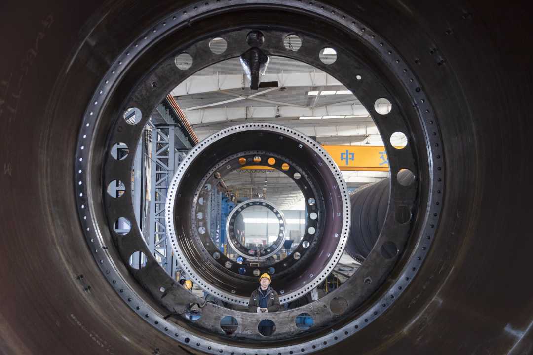 1月26日,陕西省渭南市白水县中交天和西安装备制造有限公司生产车间内,工人对风电塔筒进行质检。