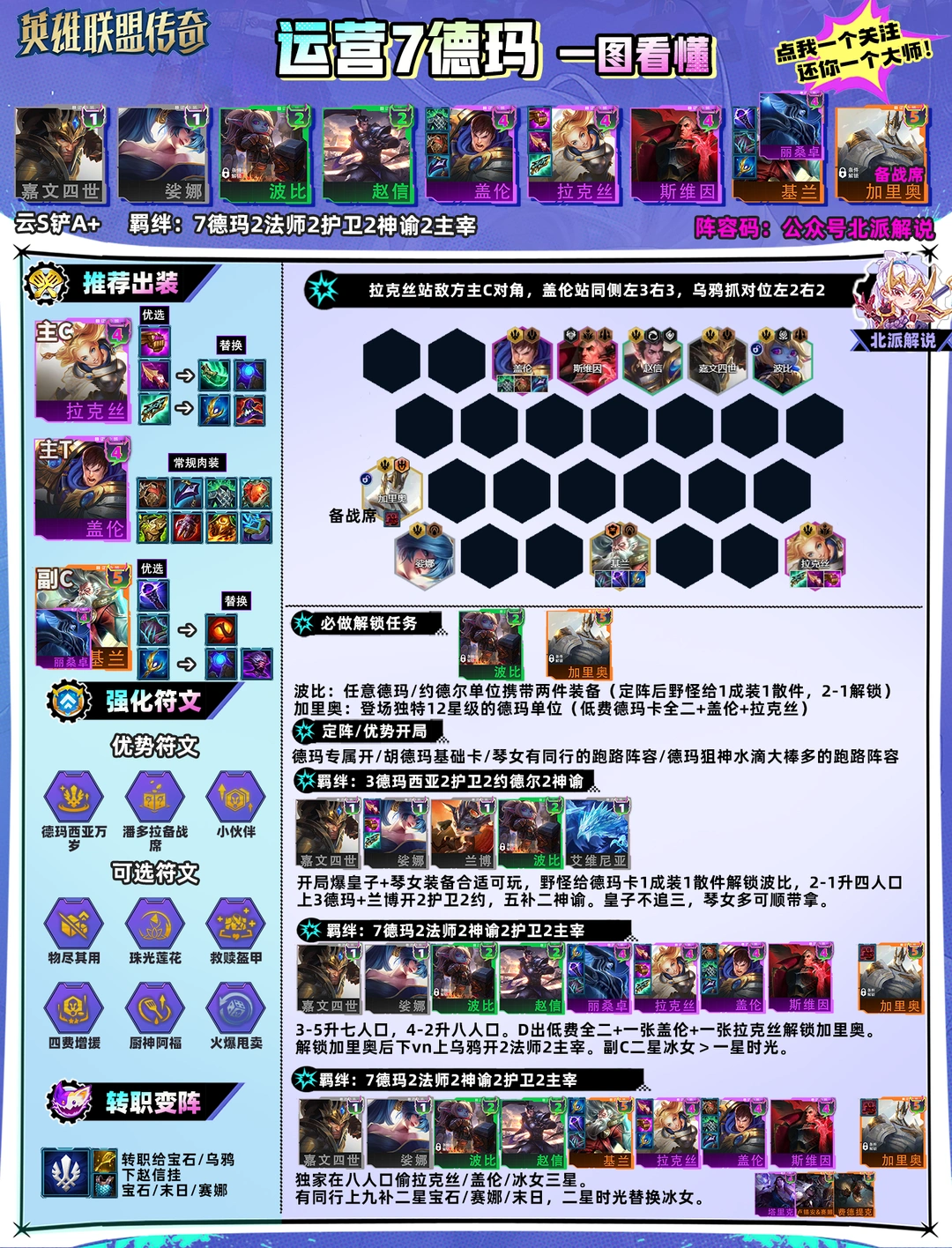 阵容强度:端S铲A+ 在上九经验削弱后,四阶段能发力的84阵容都很好吃分。 德玛强度高也绝非偶然:不刚需5费,不刚需上九,加里奥加强,纳什的加强,双C拉克丝&冰女冷门好二,非常适合当前环境的节奏。 虽然盖伦有削弱但有科技枪依旧是城墙,科技枪在对抗龙王也好用。 阵容平均排名4.11,前四率59.1,是非常稳定的上分选择。 推荐前提: ①专属符文[德玛西亚万岁]开 ②开局有二星琴女/皇子,装备合适 ③玩琴女时数量少/有同行 ④玩德玛卡莎时装备多水滴大棒/有同行 [羊刀开/多大剑]可以摇摆到德玛卡莎(多大剑玩物理卡莎) 阵容构筑: 皇子、琴女、波比、赵信、冰女/时光、拉克丝、盖伦、乌鸦、加里奥(备战席) 九人口补二星宝石/赛娜/末日/龙女 副C2星冰女>1星时光 组成羁绊: 7德玛2法师2护卫2神谕2主宰 解锁弈子: 波比:任意德玛/约德尔单位携带两件装备(定阵后野怪给1成装1散件,2-1解锁) 加里奥:登场独特12星级的德玛单位(低费德玛卡全二+盖伦+拉克丝) 装备推荐: 主C拉克丝:法爆+纳什/青龙刀/蓝霸服+科技枪/帽子/大天使/破防 奥恩神器:狙击手、卢登 1启动2输出,最优三件为法爆纳什科技枪。 实际能用的装备很多,做了纳什一定要做法爆搭配就可以。 缺装备前带法穿/重伤,优先把装备带满,后期慢慢优化。 主T盖伦:振奋、反甲、龙牙、心之钢、血手、日炎、离子 后排功能装>前排功能装。 装备尽量避免双启动(冰甲/振奋/头盔)导致技能开太早,没有顶到外面的爆发期。 副C冰女/时光:法穿棒、鬼书/红霸服、大天使/蓝霸服/头盔 功能装法穿棒+重伤必备;第三件启动装/输出装都可以,头盔能联动神谕也是好装备。 其余装备分配: 副T装备二星乌鸦>一星加里奥。 加里奥能二带第二套前排装,一星就带偷偷。