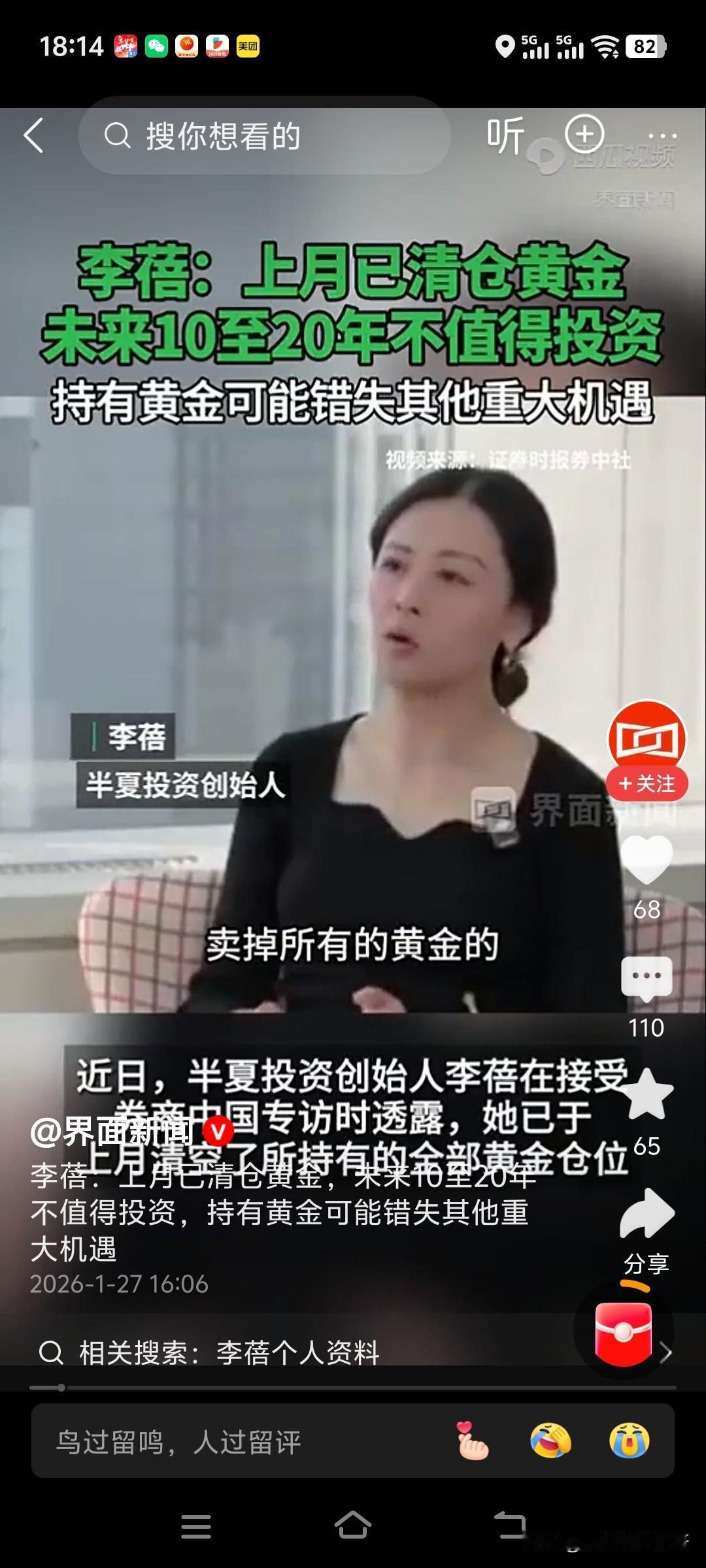 某著名投资人说了,现在黄金不值得买。 她的黄金在一个月之前就出手了。 有像我这样