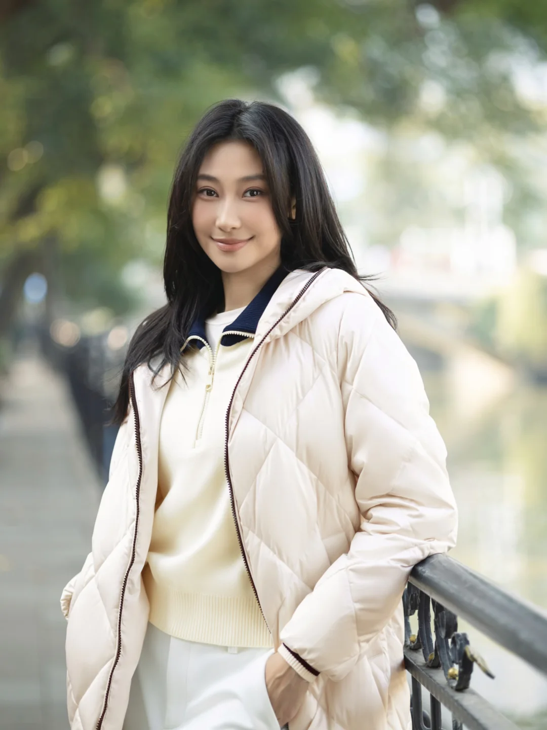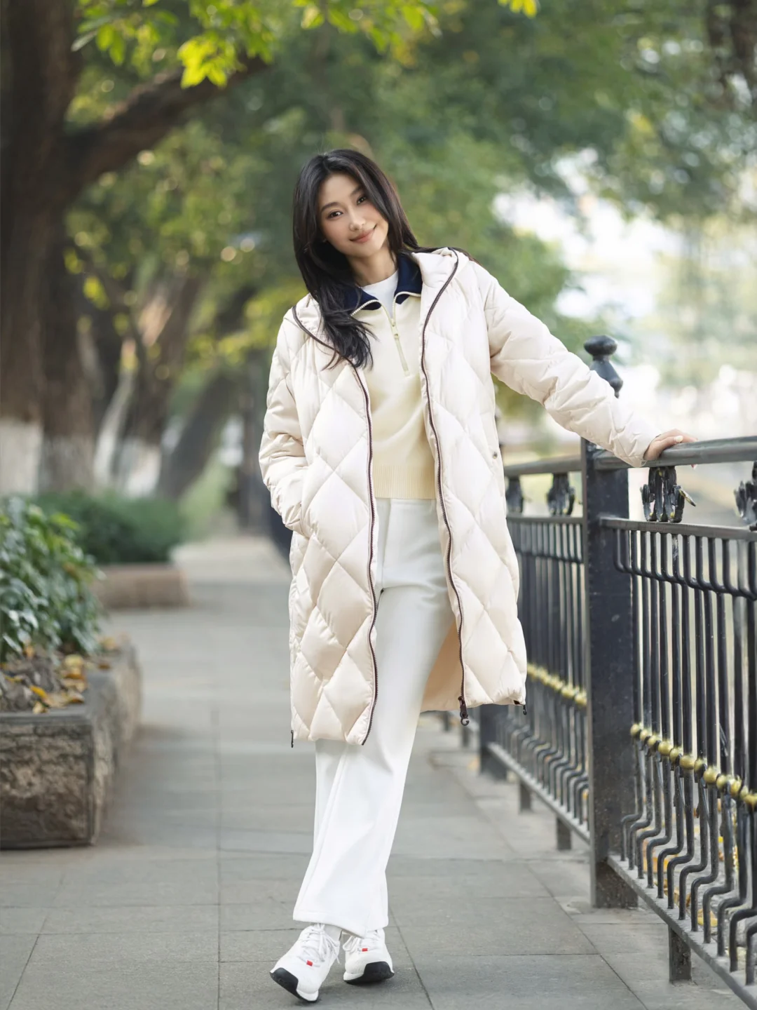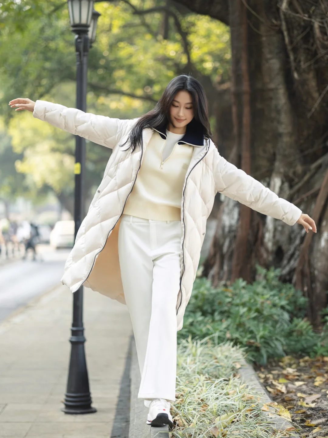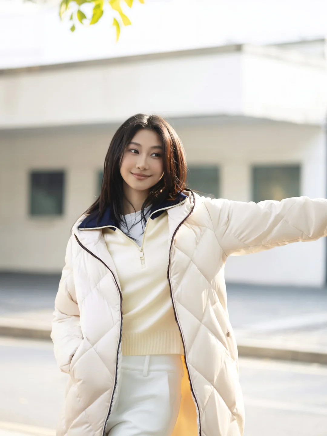 杏色特氟龙三防科技羽绒服 + 米白羊毛混纺毛衫 + 白色微喇裤,浅色系在户外光线下真的很干净,和自然环境很搭。特别设计的菱格绗缝,搭载防水/防油/防污功能性面料,时髦又实穿的羽绒服找到了,微喇裤型修饰腿型,整体看起来轻盈又有活力。