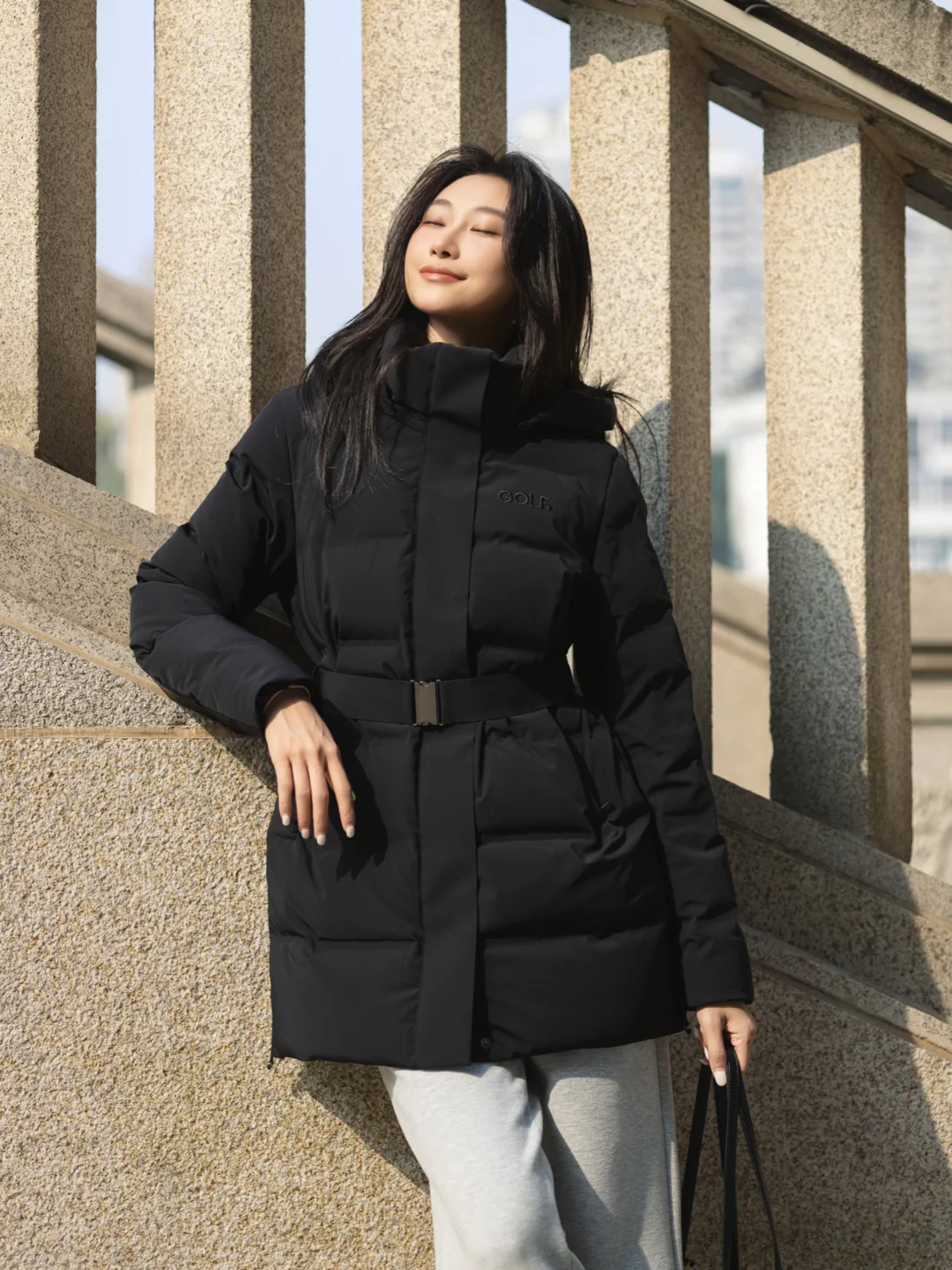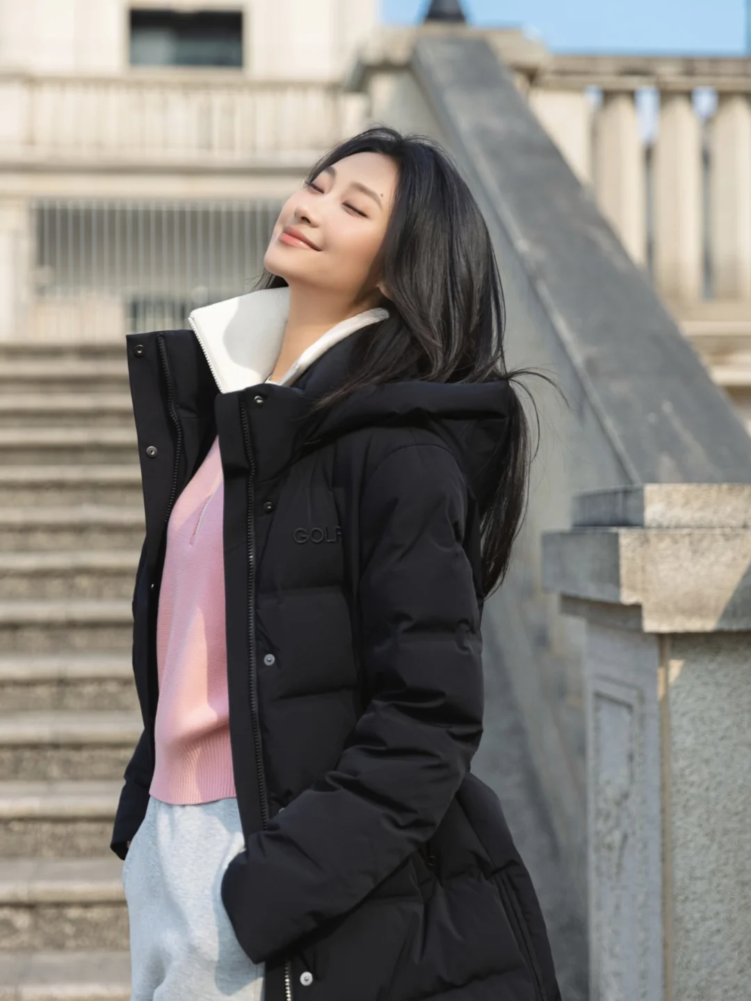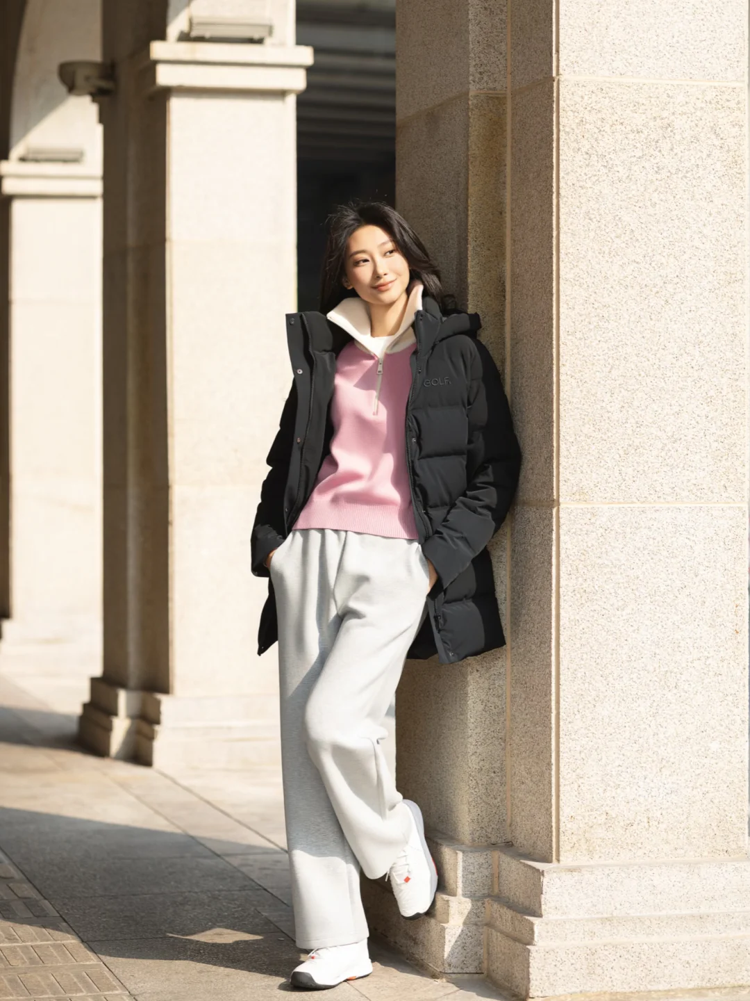 黑色防风防泼水羽绒服 + 粉红色羊毛混纺毛衫 + 浅灰针织裤,整体是很耐看的基础配色,通过内搭提亮气色。羽绒服自配腰带,优雅不会显得臃肿,休闲裤挺括与垂感刚刚好,冬日这样穿自在放松。